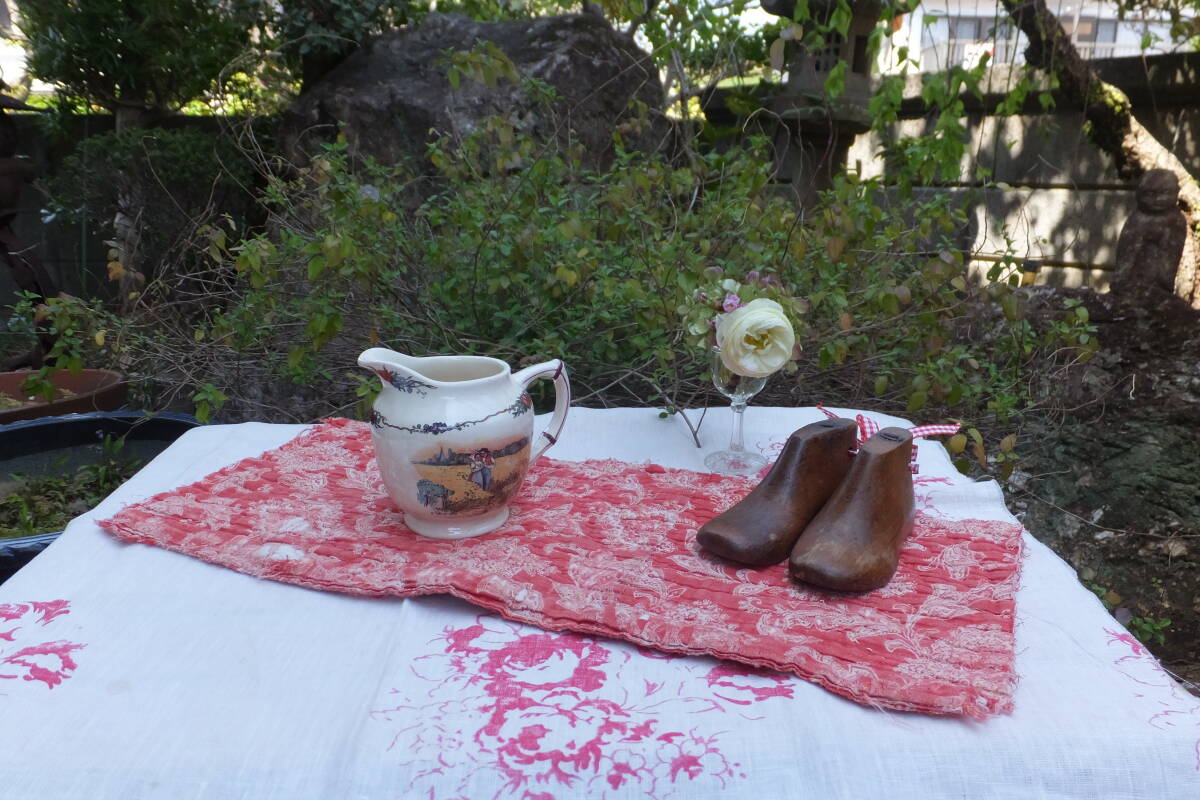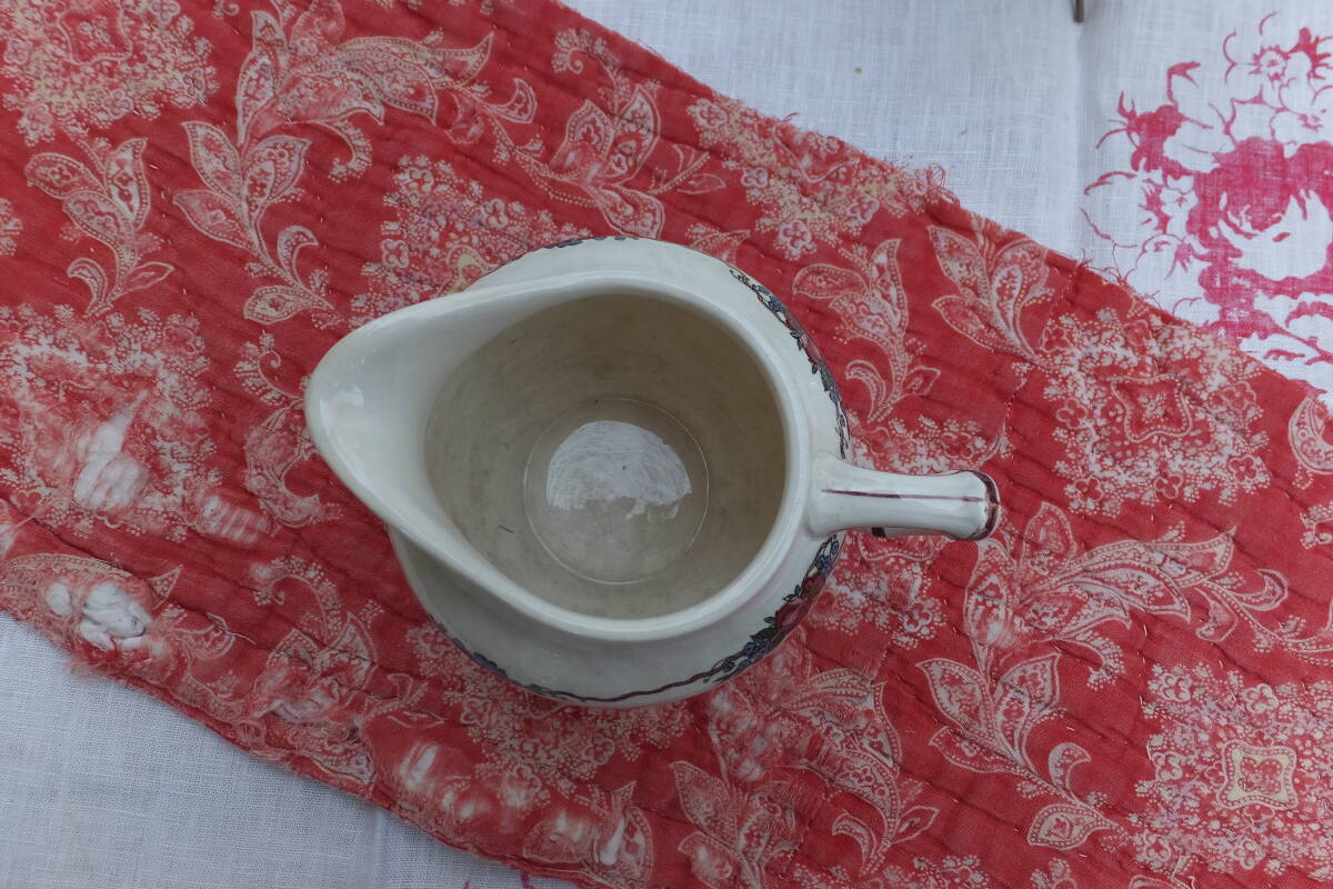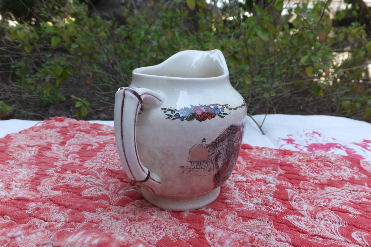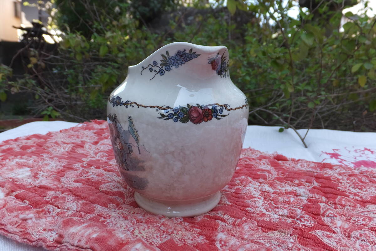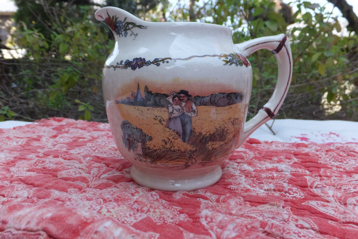フランスのパリで見つけた古いSarregueminesのObernai Faienceriesのクリーマーです。アルザス地方の民族衣装の男女と田園風景が描かれたたっぷりしたクリーマーですのでお花を生けたり・・・緑を生けたり・・・良い大きさです。カケ等はありませんが絵のない部分に多少シミがあります。french shabby chicです。