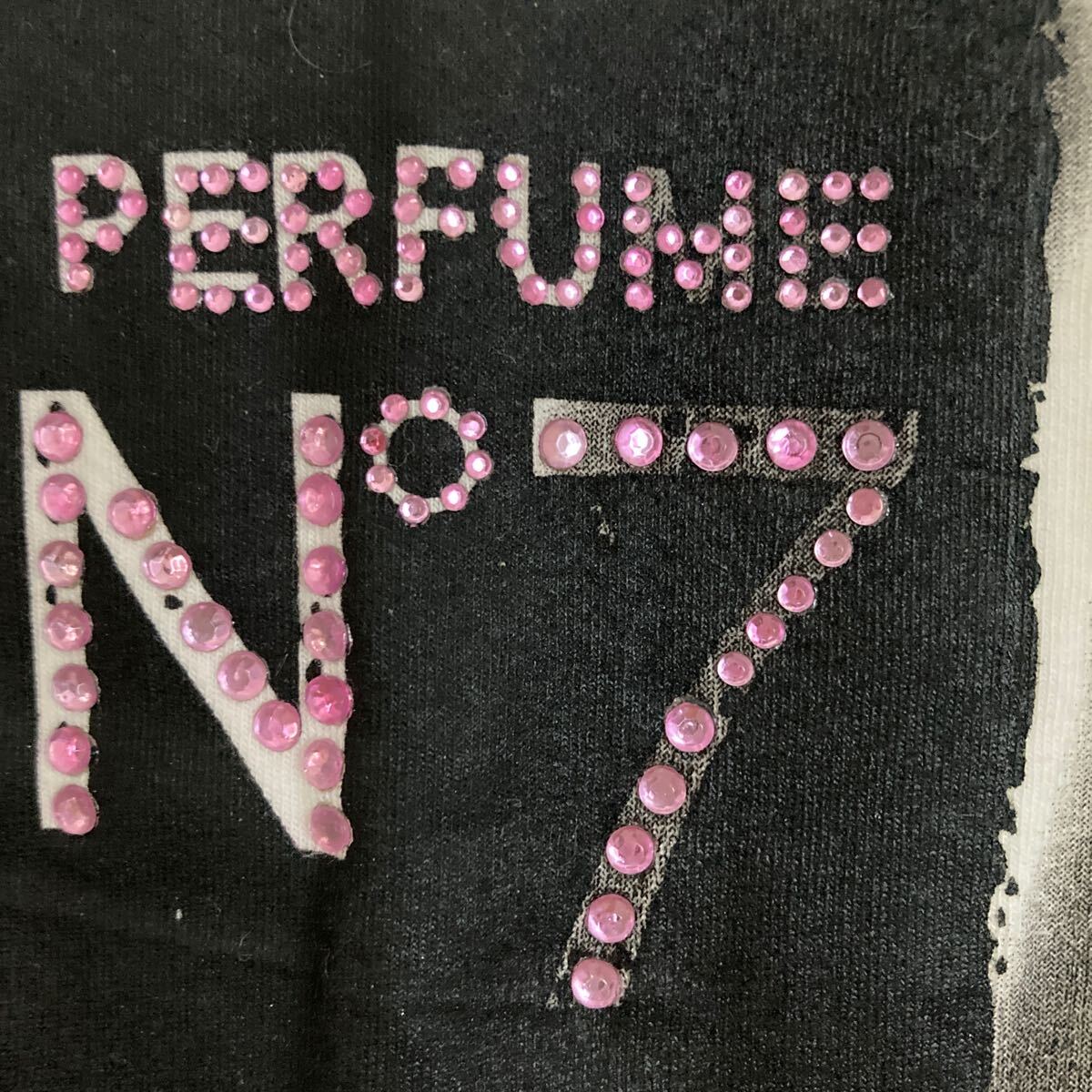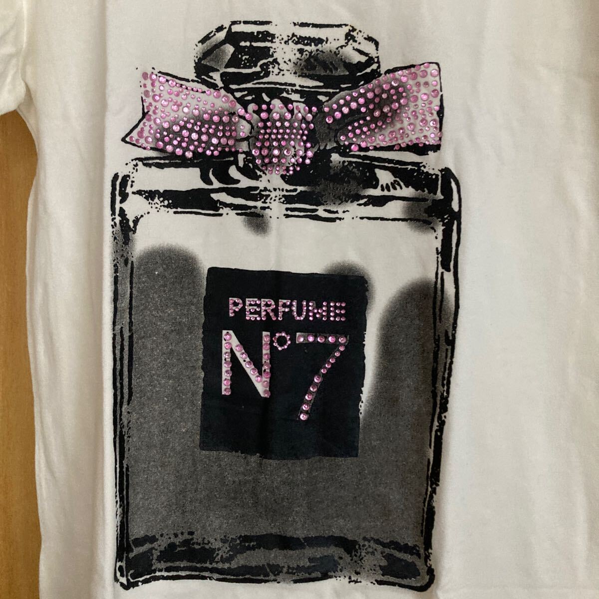 ★未使用★ パフスリーブ 香水ボトルイラスト ビジュー付き Tシャツ 白 ホワイト 半袖 綿95%
