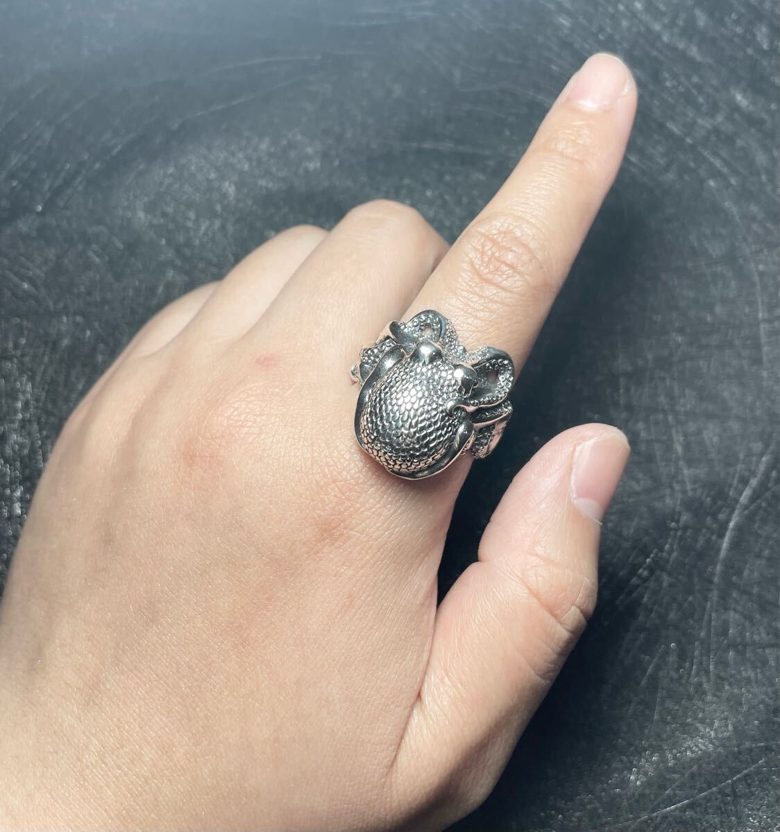 Truly magical Octopus ring with a striking combination of high polished silver and oxidised detailing, Hallmarked in the Thailand.Dimensions, at widest point 25mm, narrowest 2mm.