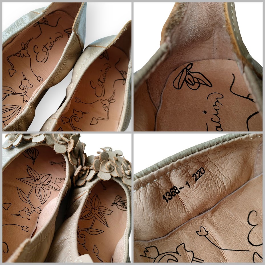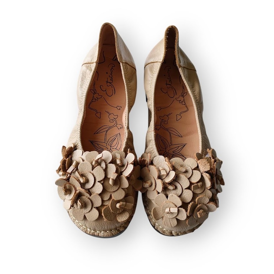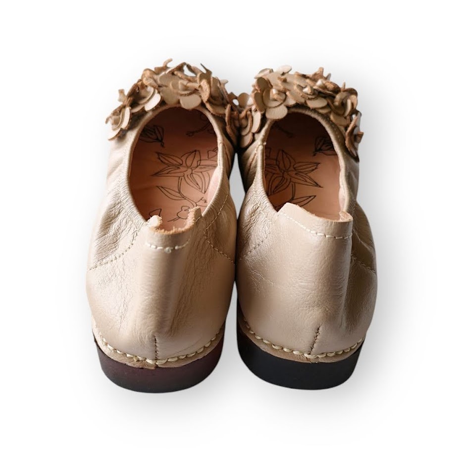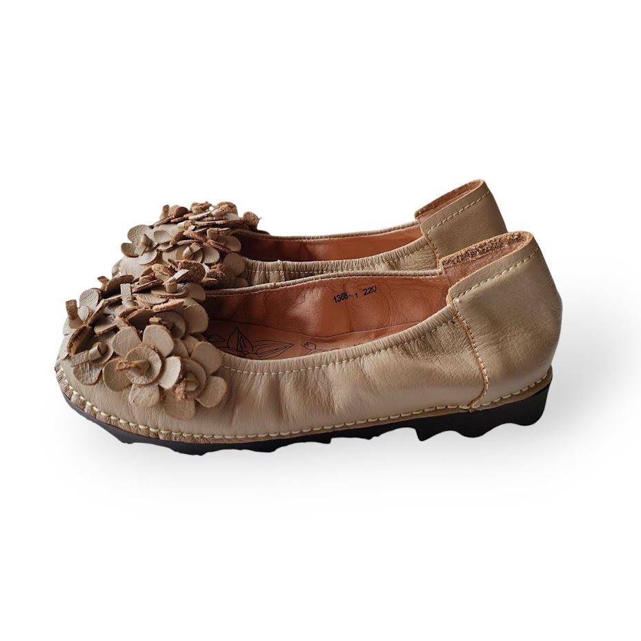 【美品】Estacionエスタシオン/立体フラワーモチーフ付ギャザーパンプス/22cm/Sサイズ/ベージュ/牛革/シュリンク加工/フラット