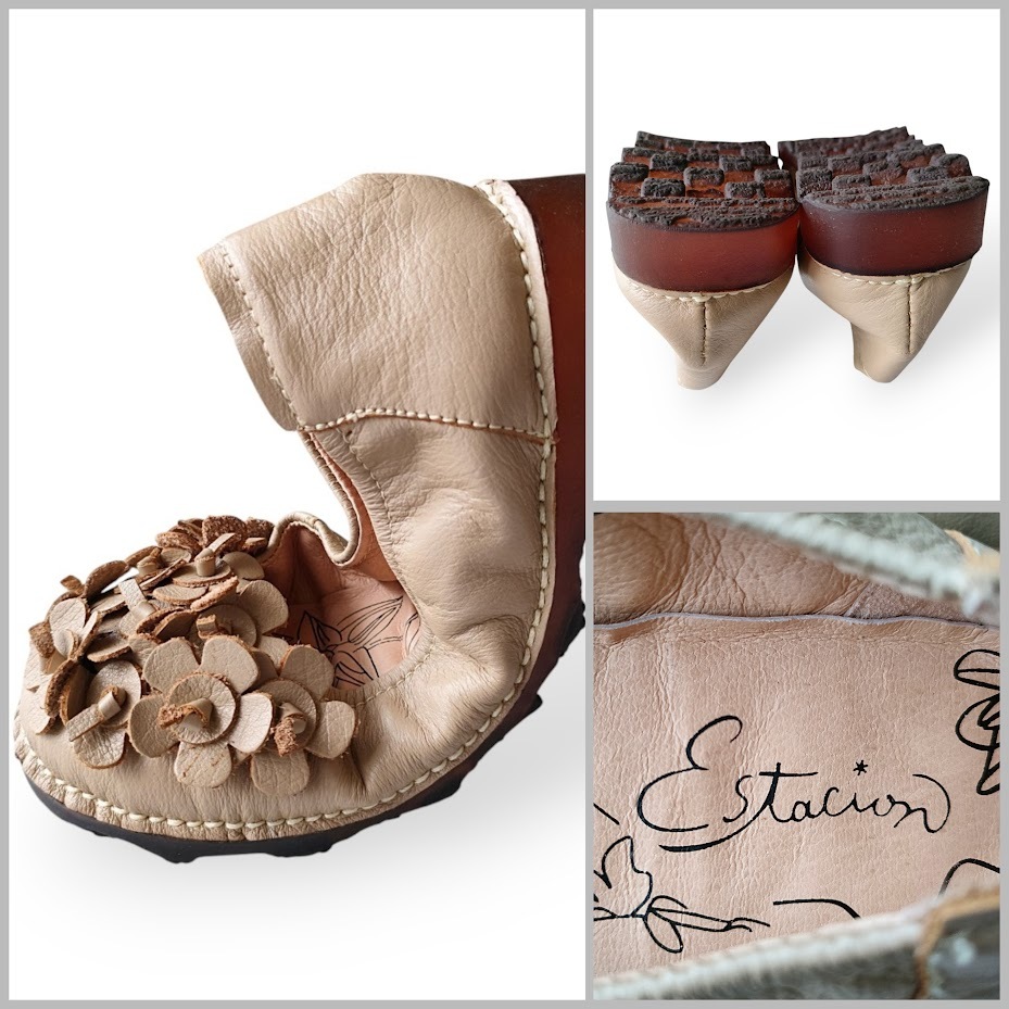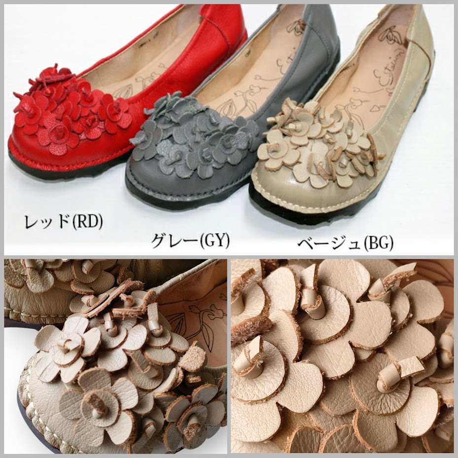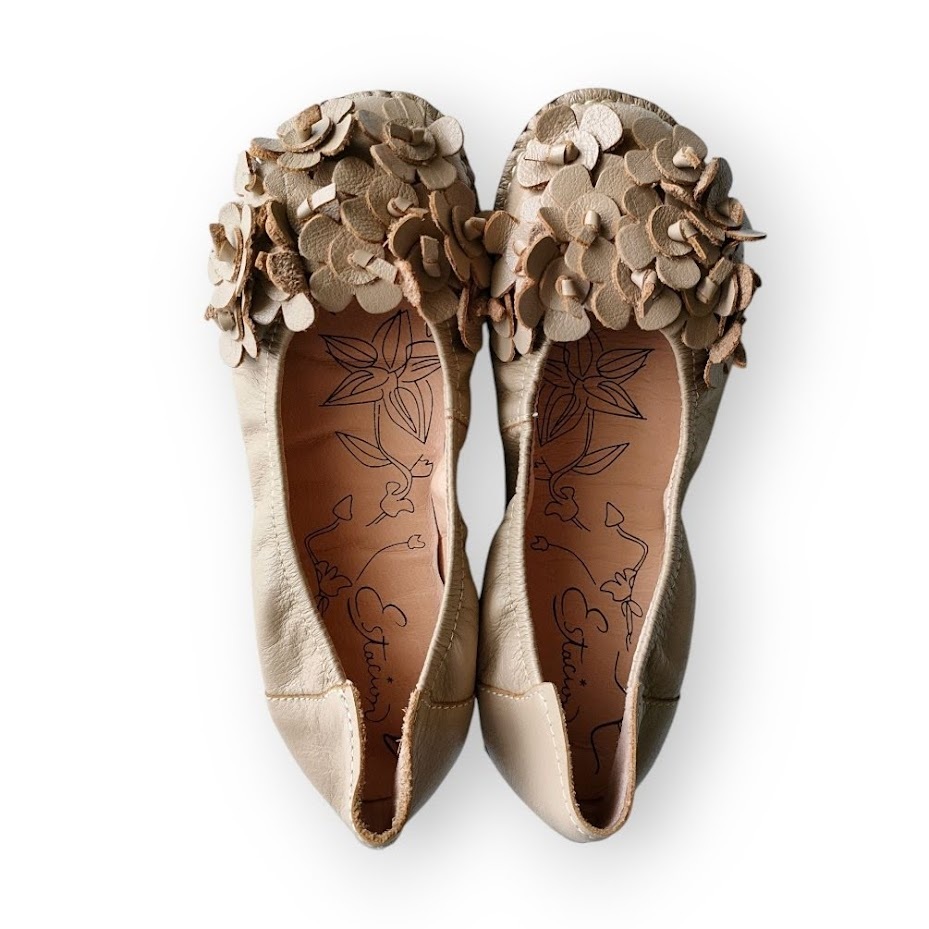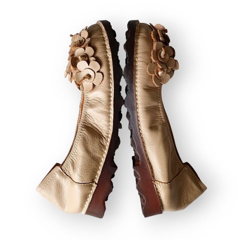 【美品】Estacionエスタシオン/立体フラワーモチーフ付ギャザーパンプス/22cm/Sサイズ/ベージュ/牛革/シュリンク加工/フラット
