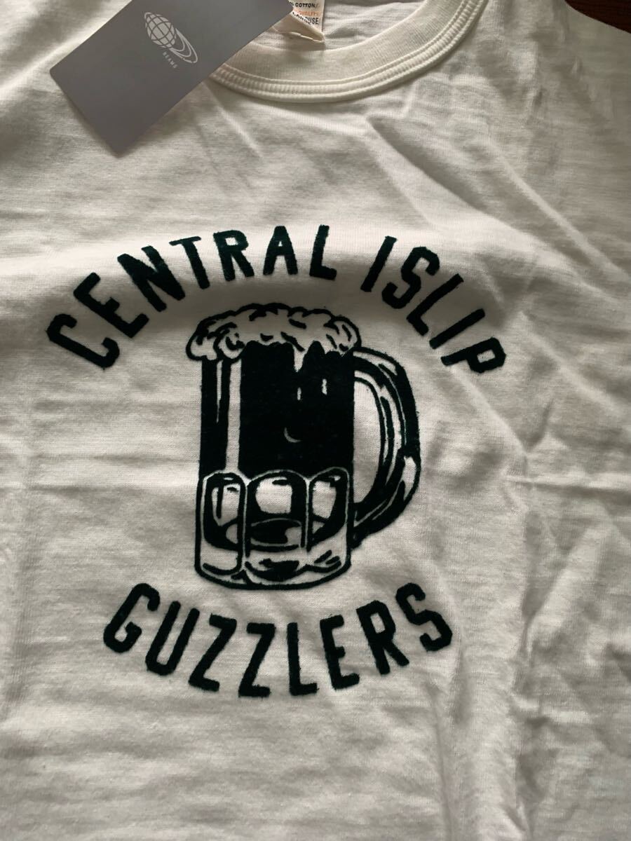 染み込み、フロッキー、ラバー、それぞれの魅力「吊り編み機より希少」といわれる旧式のローゲージ編み機で編まれた<WAREHOUSE(ウエアハウス)>の定番ボディを使用した別注Tシャツ。ムラ糸で独特の陰影が出るように編まれたこの生地はシャドウボーダーと呼ばれており、無地でありながらうっすらと横段のようなムラが浮かぶのが特徴です。極端に前下がりの現代的なネックラインではなく、フライスにパイピングをかませる事で強度を保ちながら、着込むほどにネックラインが緩み自然な前下がりが生じます。ムラ感のあるボディに入るプリントは、染み込みはヴィンテージ感のある独特のにじみやかすれが生じ、フロッキーは経年変化による魅力的な変色とひび割れ、ラバーは着用と洗濯による伸縮でひび割れが生じ、着込むほどに古着のような雰囲気に変化します。