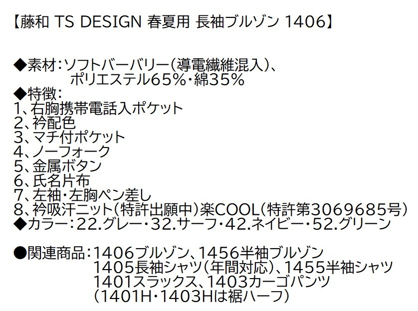 1406ブルゾン、1456半袖ブルゾン、1405長袖シャツ(年間対応)、1455半袖シャツ