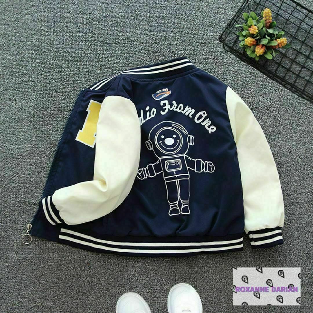 カジュアルなスタジャンジャケットにかわいいロボットデザインが施された子供用アイテム。秋冬にぴったりの着心地とデザイン。
