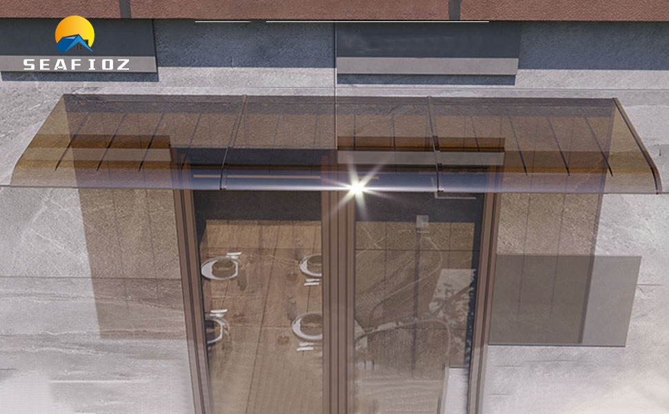 屋外住宅用ひさしは3mmのポリカーボネート素材でできており、安全で安定しており、強い耐衝撃性、抗酸化性、高温耐性、低温耐性があります。 89%透過率(視線を遮らない)、防雨・防雪性、軽量、落下物による怪我の防止