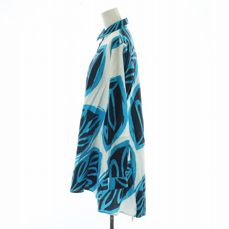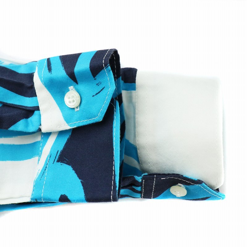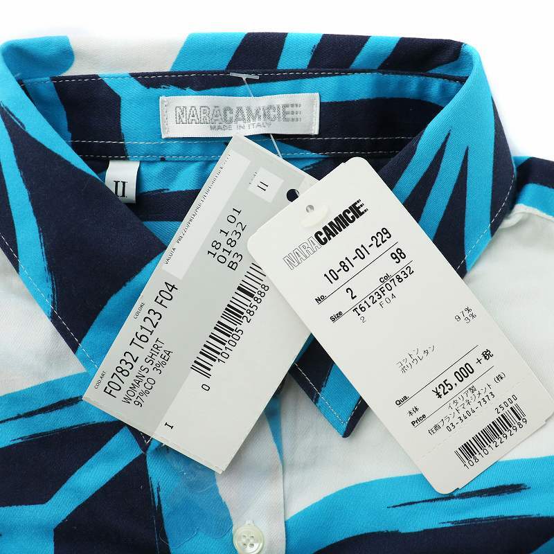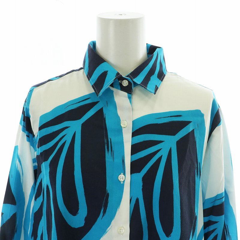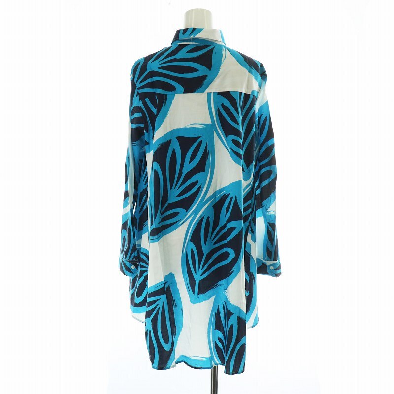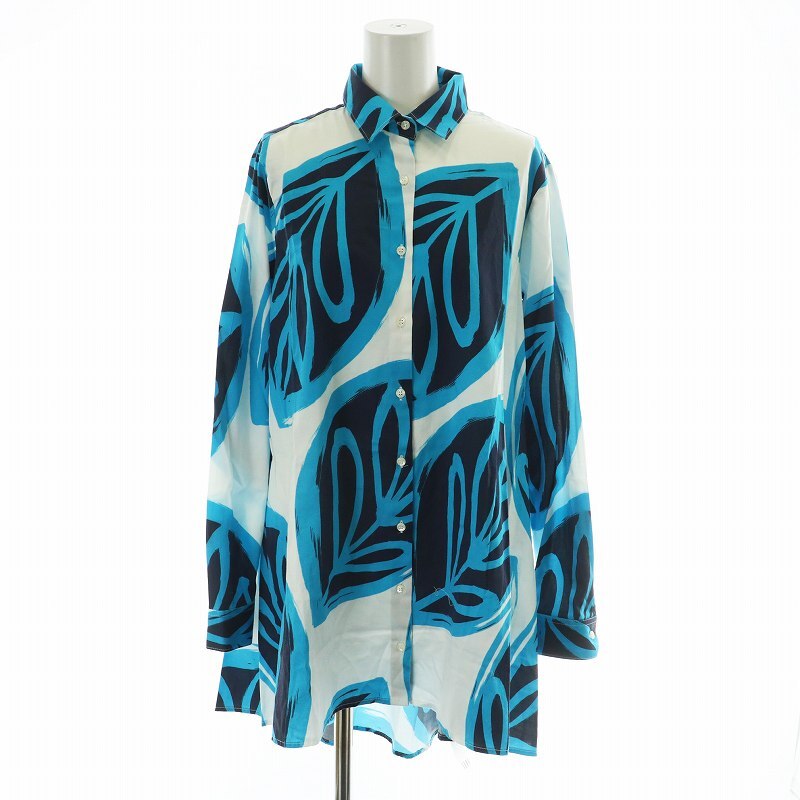 未使用品 ナラカミーチェ NARA CAMICIE リーフプリント ビック シャツ ブラウス 長袖 ロング コットン フレア 葉っぱ 総柄 2 白 青