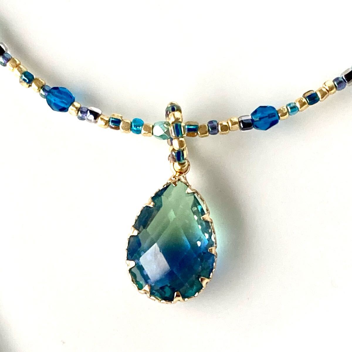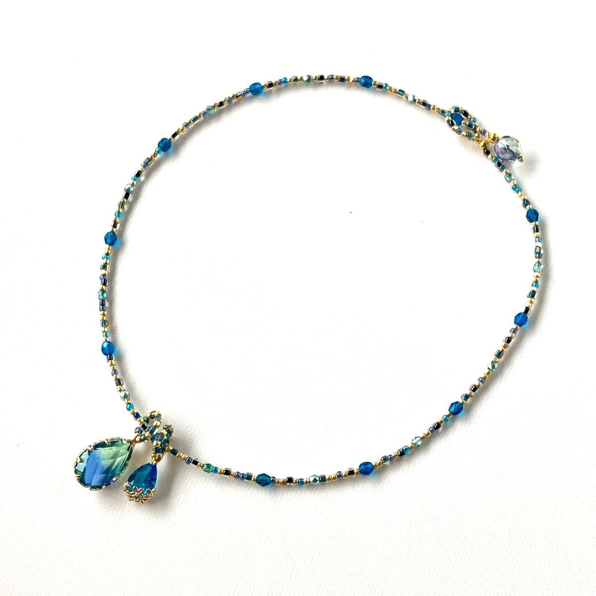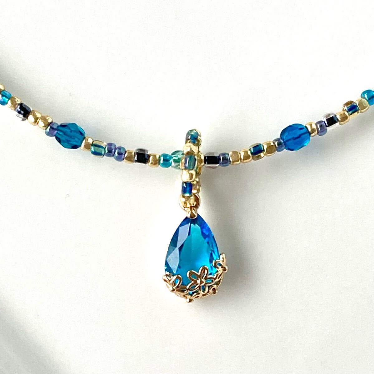 ブルーの丸小ビーズ、チェコビーズ、トライアングルビーズ、ゴールドのスリーカットビーズで作ったネックレスにブルーのドロップ型ガラスチャームを2個付けた4wayのネックレスです。