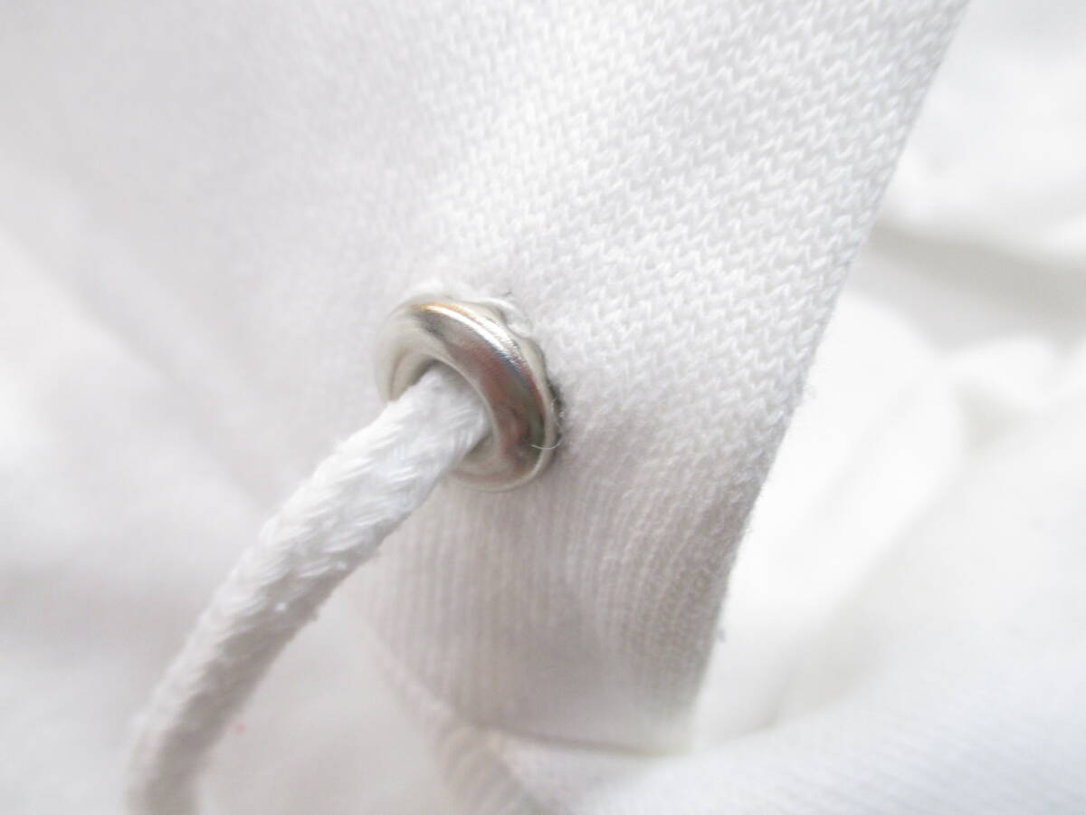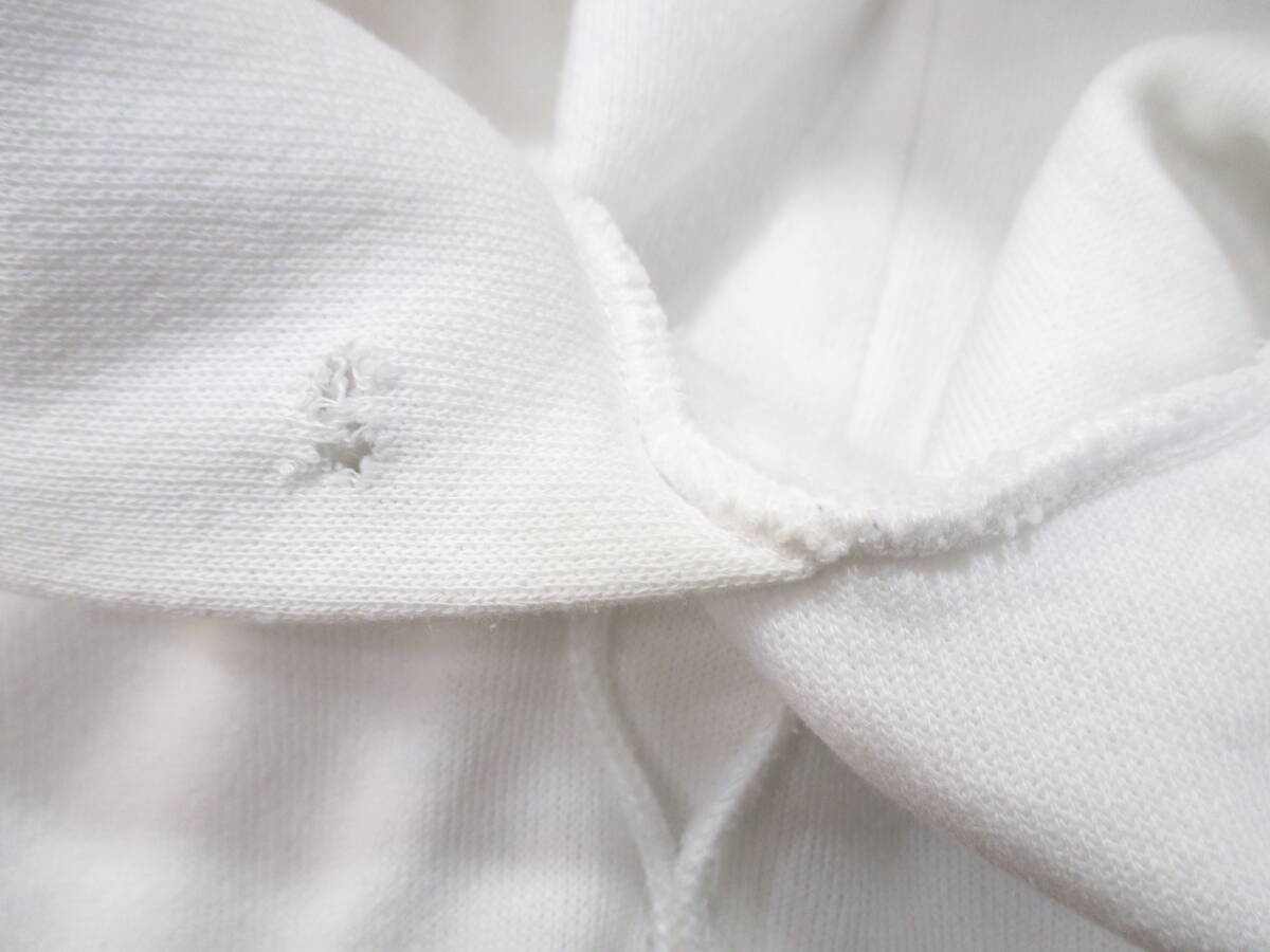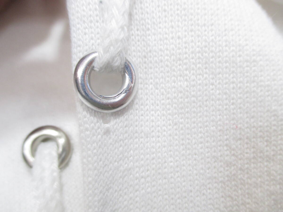 ●程度は、袖口付近に多少のシミ、フードの首元に黄ばみ、右側ハトメ裏にダメージ(画像6)、ハトメの付け根部分に少しほつれ(画像7、8)が見られます。