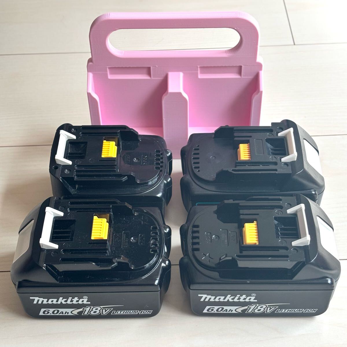 マキタの充電式バッテリーを最大4個手提げ移動できる、ロック対応のバッテリーキャリアです。
