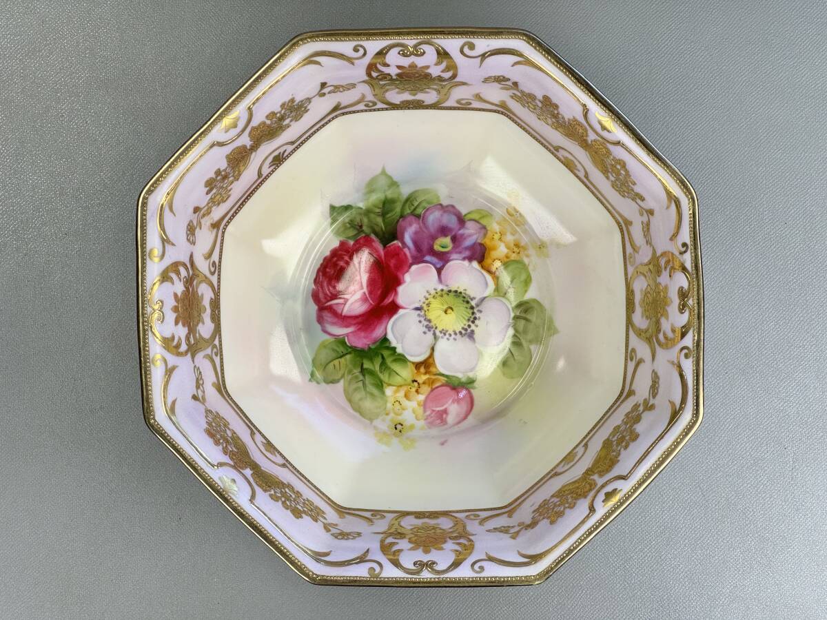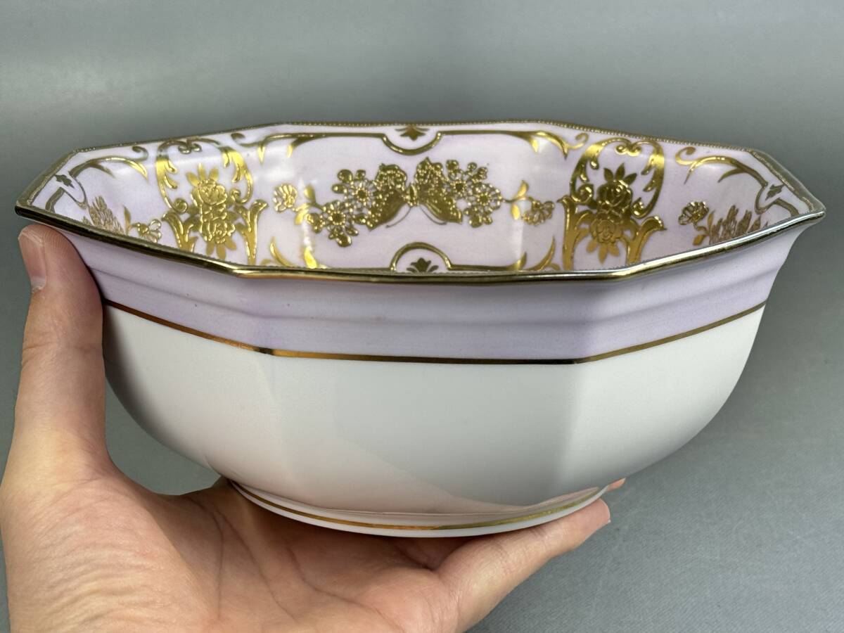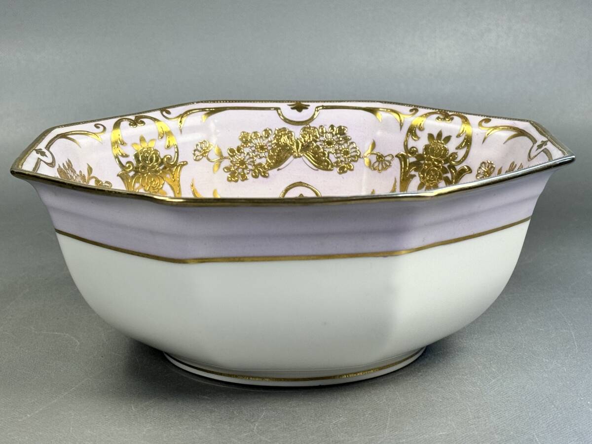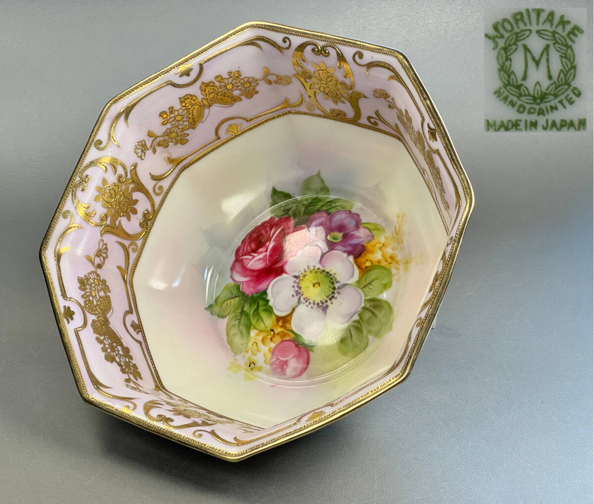 【偲】明治期Noritake オールドノリタケ 金彩薔薇 六角形 手描き 鉢 ボウル 高さ約8cm 直径約20cm r-342