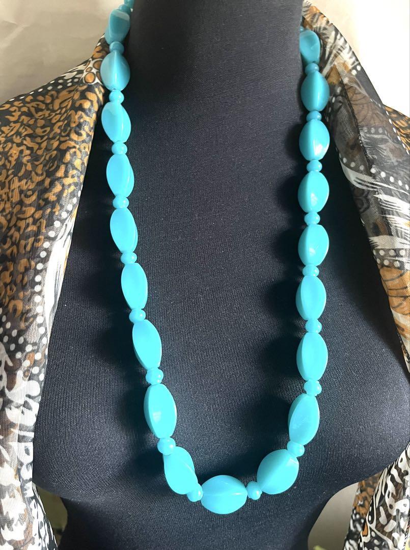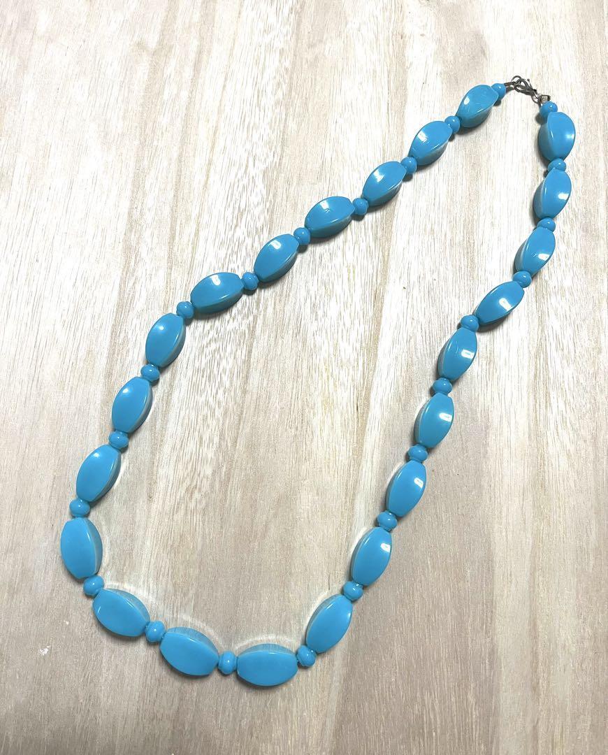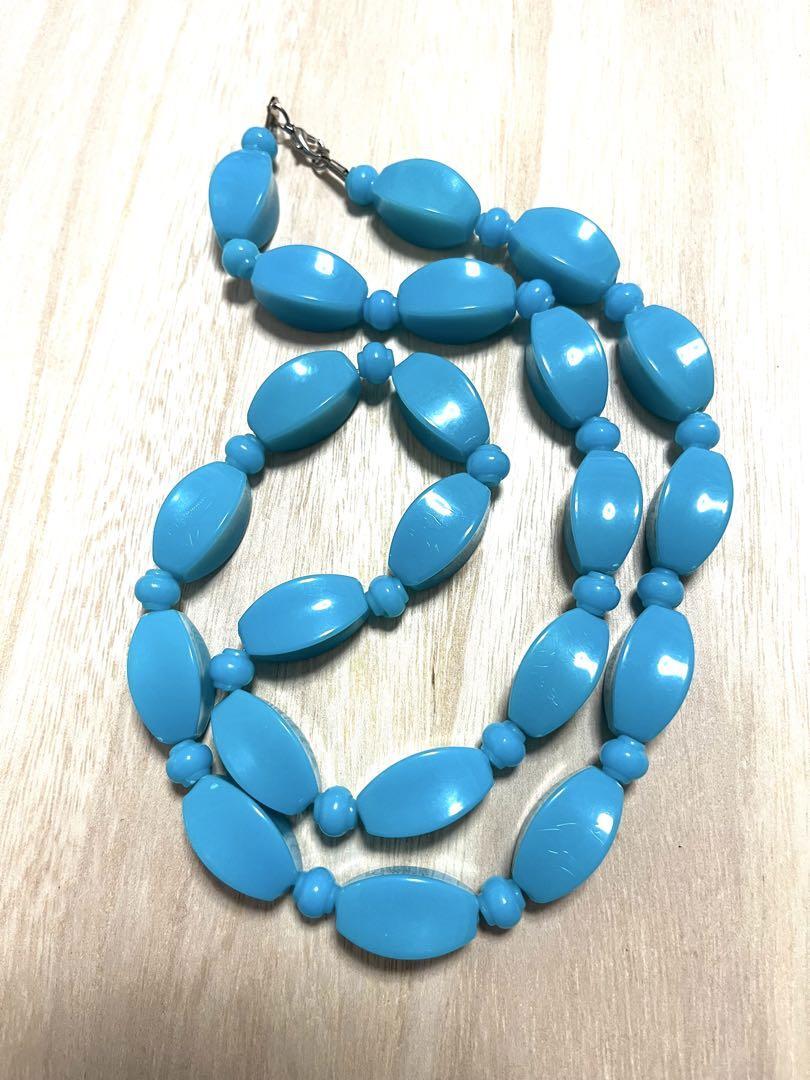 鮮やかなターコイズブルーが目を引く、レトロな雰囲気のビーズネックレスです。