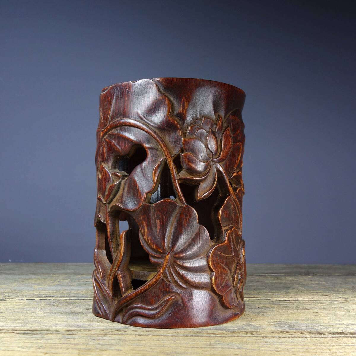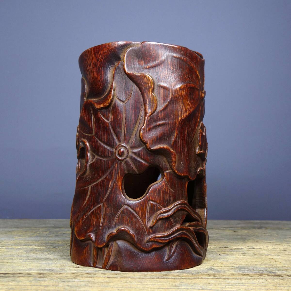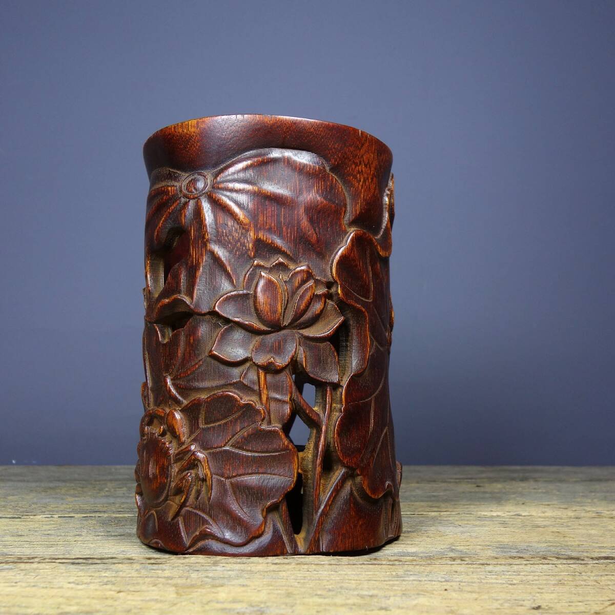 | 【蔵友館蔵品・竹材細密彫・荷花紋・筆筒】・希少珍品・置物・賞物・中国時代美術 |