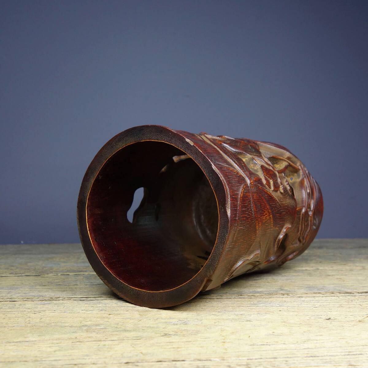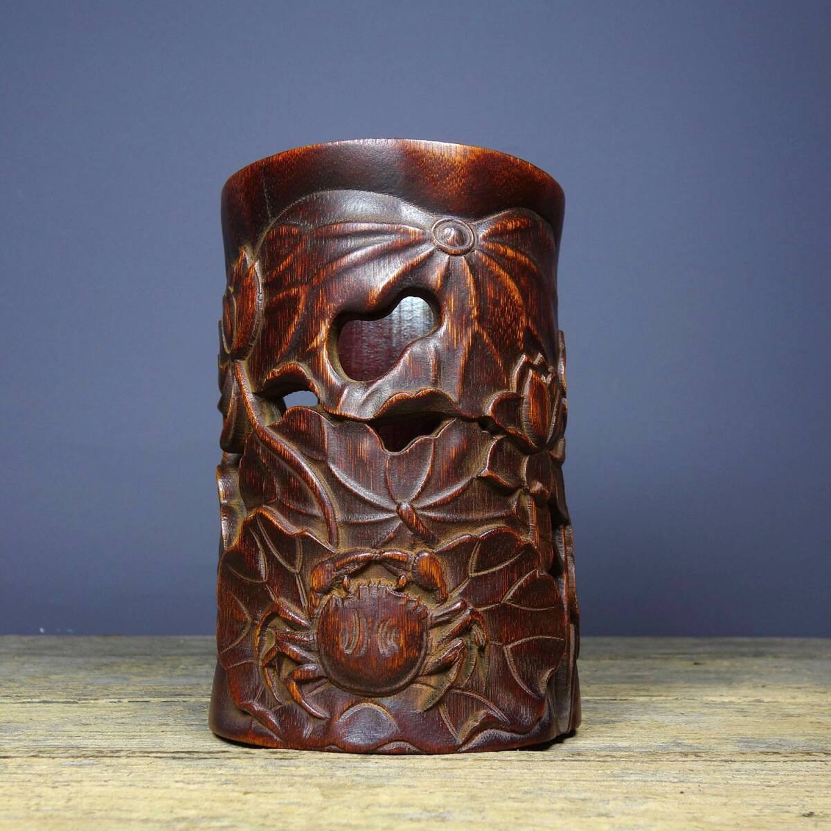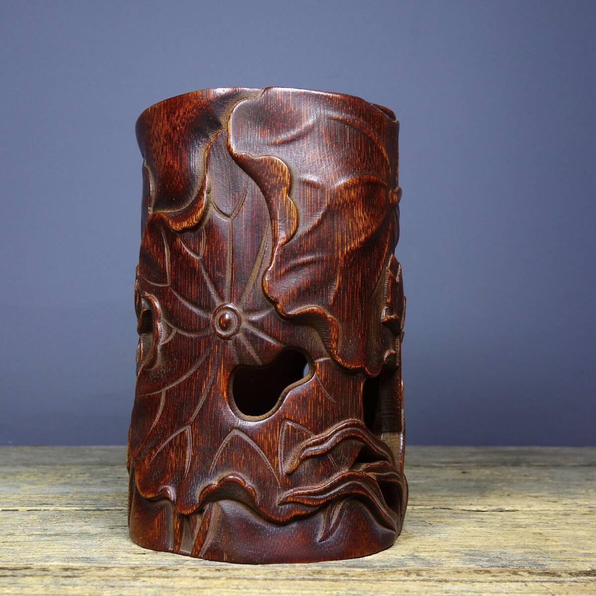 | 【蔵友館蔵品・竹材細密彫・荷花紋・筆筒】・希少珍品・置物・賞物・中国時代美術 |