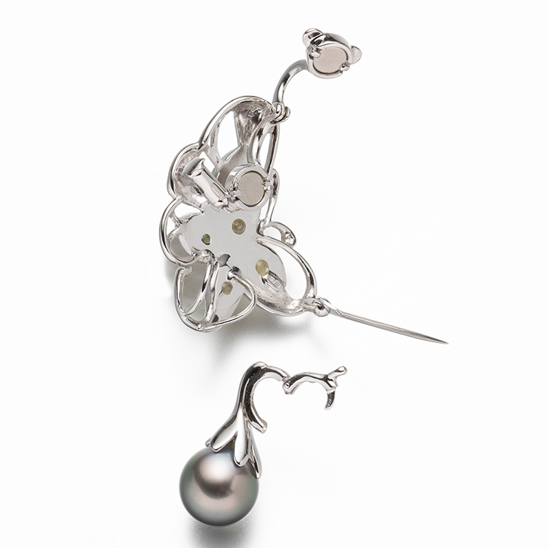 下に揺れる黒蝶パールは取り外し可能で、ブローチとしてはもちろん、ペンダントヘッドとしてもお使いいただけます。