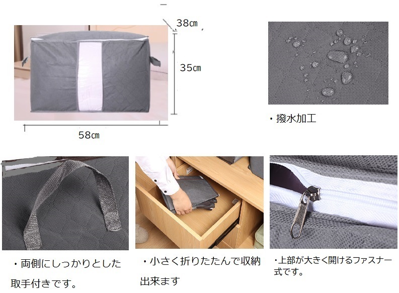 不織布収納ケース(グレー)2枚セット:58*38*35cm 衣類収納 布団収納 大容量 ご覧いただきましてありがとうございます。 ・オフシーズンの衣類、毛布、敷パッドなどの寝具の長期保管にピッタリです。そして、この収納袋はコンパクトに折りたためるから、ケースのように押入れの場所をムダに占領してしまうことはありません。 ・収納ケースが長持ちする不織布で作製し、しっかりした作りで安心感があります。薄くて軽いても、耐久性があり、防虫、防塵、湿気を隔離するには役に立ちます。布団、衣類などを押し入れ、長時間防湿できます。不織布の通気性もいいので収納後に積み重ねて狭い場所にも押し込めます。 ・ビニールの透明窓が付いているので、中身が一目でわかるので、開けなくても何が入っているのかわかりやすい、探す手間も省けます。収納ケースを開くこともとっても簡単です!左右両開きファスナー開けるとすぐ開けられるのが便利です。金属製のジッパーは壊れにくい&チャックが大きく開くので出し入れもしやすいです。 ・両側にしっかりとした持ち手があります、柔らかい手触りで手の痛みがなくなり、クローゼットから引っ張り出す時には使いやすい、移動や引越などの荷物運びにもとっても便利です。 ・毛布・布団・衣類の圧縮を実現できて便利な収納袋です 。室内で普段使わない物をスッキリ整理整頓、狭いスペースでスッキリ、 家庭の旅行・出張・引越しにも最適です。バッグ以外の用途としては丸めたタオルを縦に詰めたり、ソックスなど軽い物を収納するのにも利用できます。