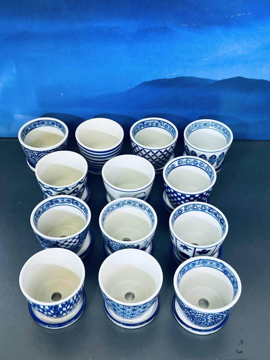 【皿付き そば猪口型 植木鉢 6点セット 柄ランダム】 染付 陶器 盆栽 植物 多肉 庭園 お庭 人気 ガーデニング お庭