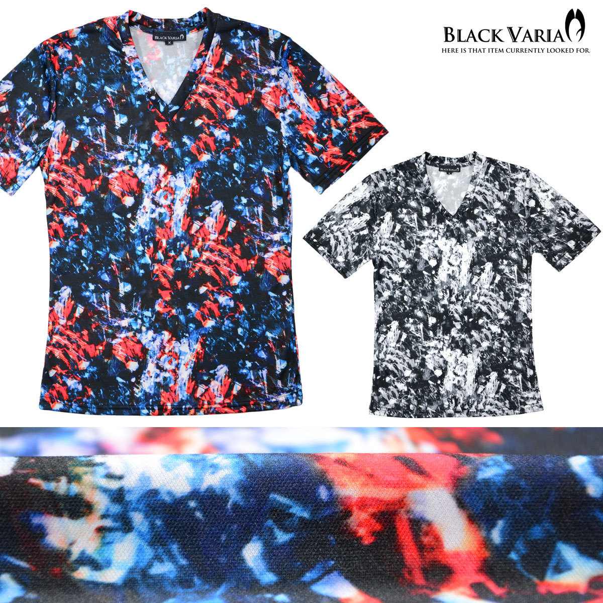 9#173307-rebl [SALE] BLACK VARIA ムラ柄 スリム ストレッチ クリスタル柄 総柄 半袖 Tシャツ メンズ(レッド赤ブルー青) L 送料370円~
