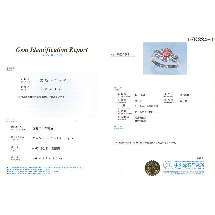 | 素材 | Pt900 ピンクサファイア0.60ct D0.51ct | ||