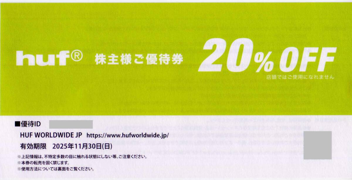 ご覧頂きありがとうございます。 商品掲載内容未確認によるトラブル防止のため、必ず最後まで掲載内容をお読み頂き、商品掲載内容にご同意の上、ご入札下さい。 ★最新 TSIホールディングスグループ HUF JAPAN 株主様ご優待券20%OFF券★送料無料条件有★です。 入札は、TSIホールディングスグループ HUF JAPAN 株主様ご優待券20%OFF券1枚当たりの金額でお願いします。 ◇◆商品説明◆◇ ★本券は、直営オンラインショッピングサイト「HUF WORLDWIDE JP」ハフワールドワイドJPのみご使用頂けます。店頭ではご利用頂けません。 ★本券は、ご利用期間中、1回のみご使用頂けます。 ★割引率は、オンラインショッピングサイトのご利用可能限度額(消費税込)までのお買物につき20%となります。 ★有効期限は、2025年11月30日23:59です。 ◇◆発送方法と送料について◆◇ ★送料は、落札者様のご負担でお願いいたします。基本発送は、普通郵便(定形郵便)にて発送させて頂きます。 但し、郵便事故による不着、あるいは郵送中の損害による返金、あるいは代替商品補償の責任は負いかねますのであらかじめご了承下さい。 ご不安な場合には、追跡記録可能または損害補償対象の発送方法をお奨めいたします。なお、郵便事故が発生した場合には、出来る限りのご協力はさせて頂きます。 また、郵便配達サービス変更に伴い、土曜日配達の中止、お届け日数の繰り下げが実施されています。普通郵便・特定記録郵便の場合、到着まで時間を要する場合がございます。 あらかじめご了承頂くとともに余裕をもったご対応を頂きますようにお願いいたします。 ●普通郵便(定形郵便)は110円(発送重量50gまで)(損害補償対象外)(土曜日・日曜日・休日配達中止) ●特定記録郵便は、普通郵便(定形郵便)+210円(追跡記録可能)(損害補償対象外)(土曜日・日曜日・休日配達中止) ●速達郵便は、普通郵便(定形郵便)+300円(損害補償対象外)(土曜日・日曜日・休日配達実施) ●書留郵便は、普通郵便(定形郵便)+480円(追跡記録可能)(損害補償対象)(土曜日・日曜日・休日配達実施) ●簡易書留郵便は、普通郵便(定形郵便)+350円(追跡記録可能)(損害補償対象)(土曜日・日曜日・休日配達実施) ●レターパックプラスは600円・レターパックライトは430円(追跡記録可能)(損害補償対象外)(土曜日・日曜日・休日配達実施) ●スマートレターは210円(損害補償対象外)(土曜日・日曜日・休日配達中止) ★発送方法については、普通郵便(定形郵便)・特定記録郵便・速達郵便・簡易書留郵便・書留郵便・ゆうパック(損害補償対象)(土曜日・日曜日・休日配達実施)・ クロネコ宅急便(損害補償対象)・レターパック(プラス・ライト)・スマートレター等、落札者様のご希望発送方法に対応いたします。 但し、ミニレター(郵便書簡)、クリックポストについては対応いたしかねますのであらかじめご了承ください。 ★即決価格でご落札された場合には、普通郵便(定形郵便)に限り出品者が送料を負担いたします。 また、即決価格の90%以上でご落札された場合には、普通郵便(定形郵便)に限り出品者が送料の50%を負担いたします。 但し、即決価格、あるいは即決価格の90%以上でご落札された商品を普通郵便(定形郵便)以外の発送方法でご希望される場合、送料は落札者様全額ご負担とさせて頂きます。 あらかじめご了承下さい。 なお、即決価格、あるいは即決価格の90%以上でご落札された商品と同梱発送をご希望される場合、送料は落札者様全額ご負担とさせて頂きます。あらかじめご了承下さい。 ★取引メッセージにて、優待IDのみをお知らせすることも可能です。その場合は送料無料です。 この発送方法をご希望する場合、落札後、発送方法を定形郵便にご選択頂き、取引メッセージにて「取引メッセージ希望」とお知らせ下さい。送料無料にて手続きさせて頂きます。 ◇◆備考・その他◆◇ ●誠実、迅速に対応いたしますので、よろしくお願いいたします。 ●自己紹介欄もどうぞご覧下さい。 ●他にも多数出品しておりますのでどうぞご覧下さい。 ●ご落札から48時間以内に落札者様情報のご連絡を必ずお願いいたします。 ご連絡を頂けない場合には、お取引の意思がないと判断させていただき、落札者様のご都合により即キャンセルとさせて頂きます。十分にご留意下さい。 また、落札者様情報のご連絡があるまでは、取引メッセージによるご質問等には一切ご回答いたしかねますのであらかじめご了承下さい。 ●落札者様情報のご連絡を頂いた後、落札者様から何もご連絡がなく、ご落札から72時間以内にご決済頂けない場合には、 落札者様のご都合により即キャンセルとさせて頂きます。十分にご留意下さい。 また、落札者様からご連絡があった場合でも、かんたん決済支払期限を超過した場合は、落札者様のご都合により即キャンセルとさせて頂きます。 なお、この場合、出品者にて商品を削除させて頂く際、落札者様の評価に対して「非常に悪い」を付けさせて頂きます。ご了承の上、