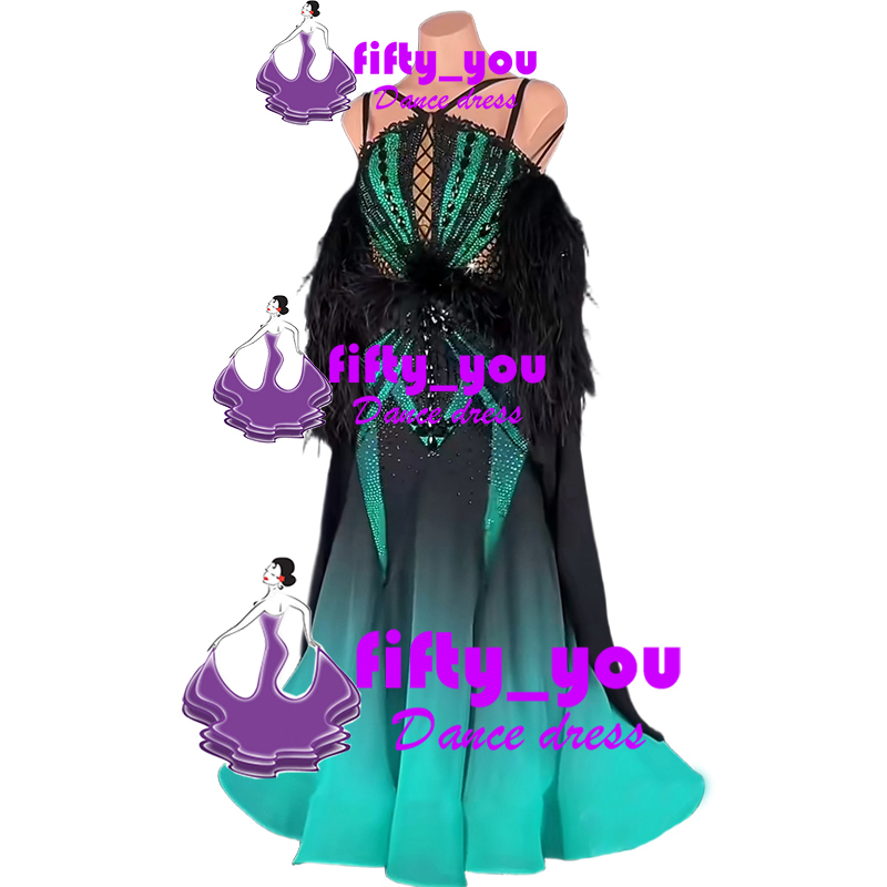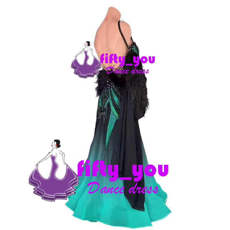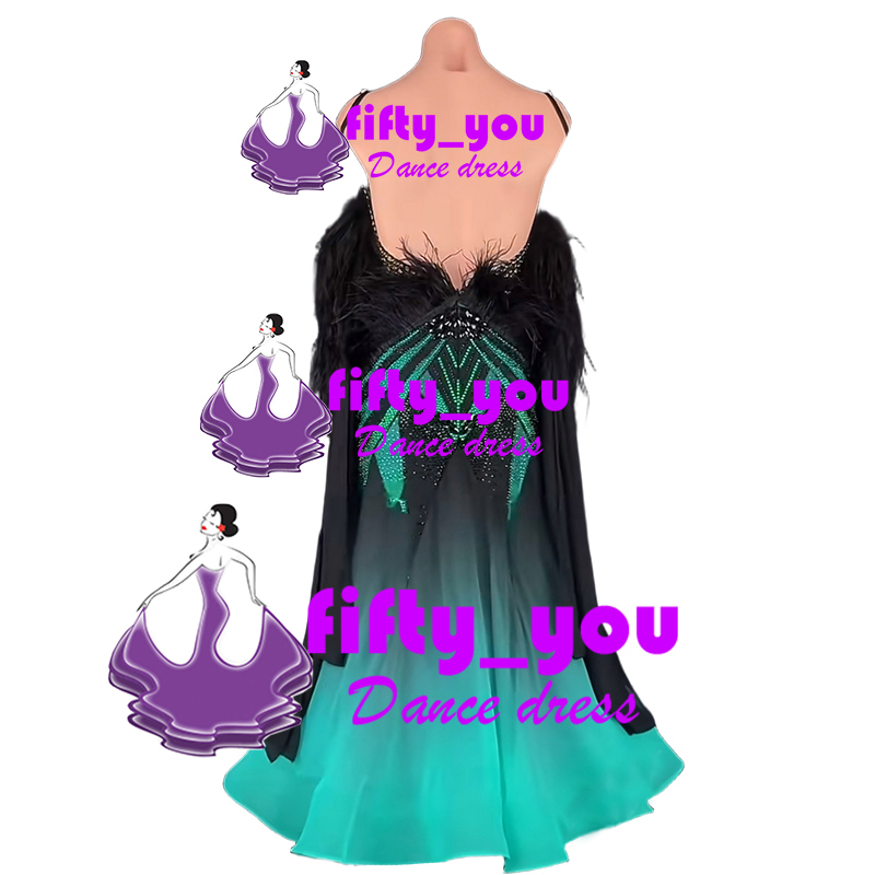 新品fifty_you レディース社交ダンス衣装 高品質モダンドレス セミオーダー スタンダードドレス お洒落グラデーション色 羽飾り