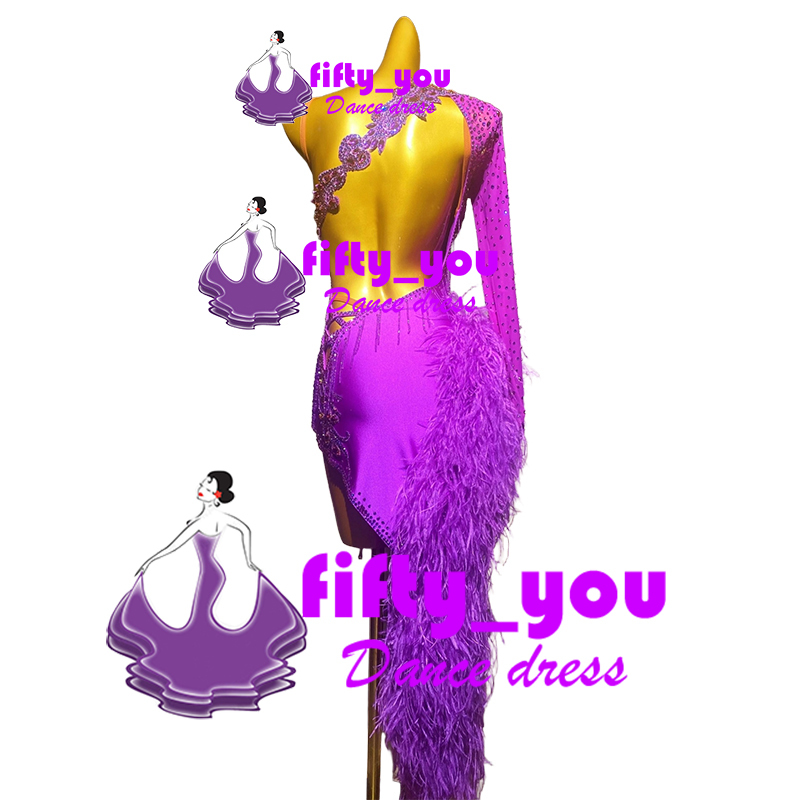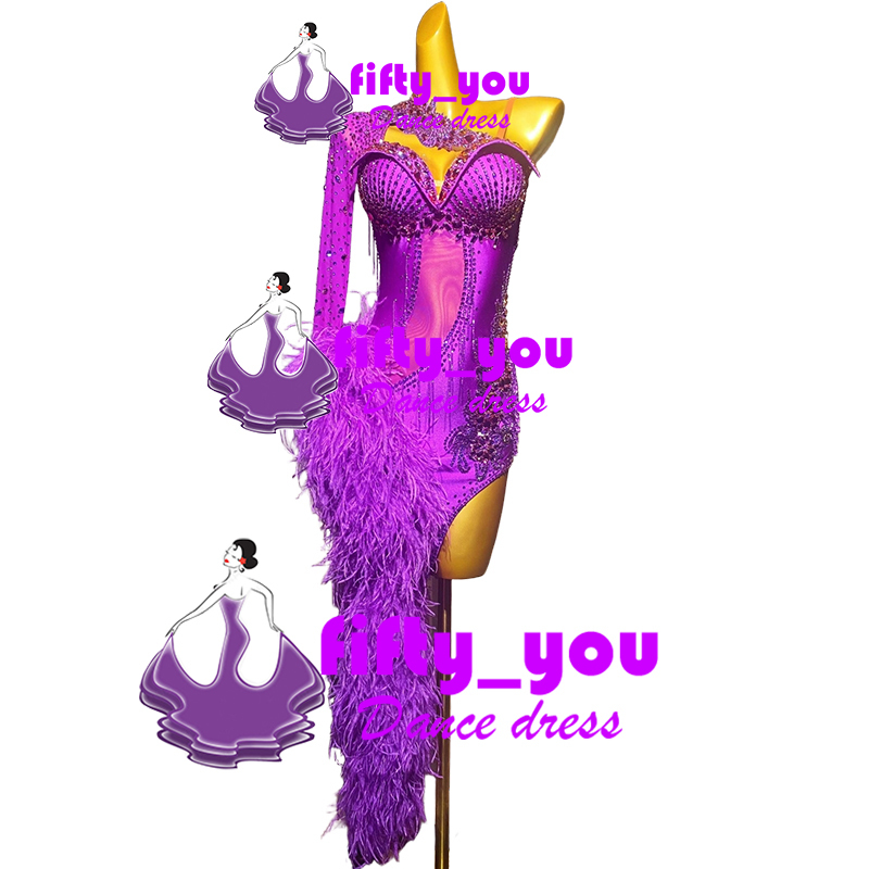 新品fifty_you レディース社交ダンス衣装 ラテンドレス 競技試合デモ着用高品質ダンスドレス フワフワ羽飾り 動き出すビーズ飾り