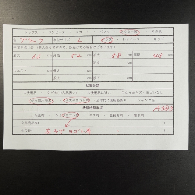 ・シミやヨゴレ有(左そで ヨゴレ有)