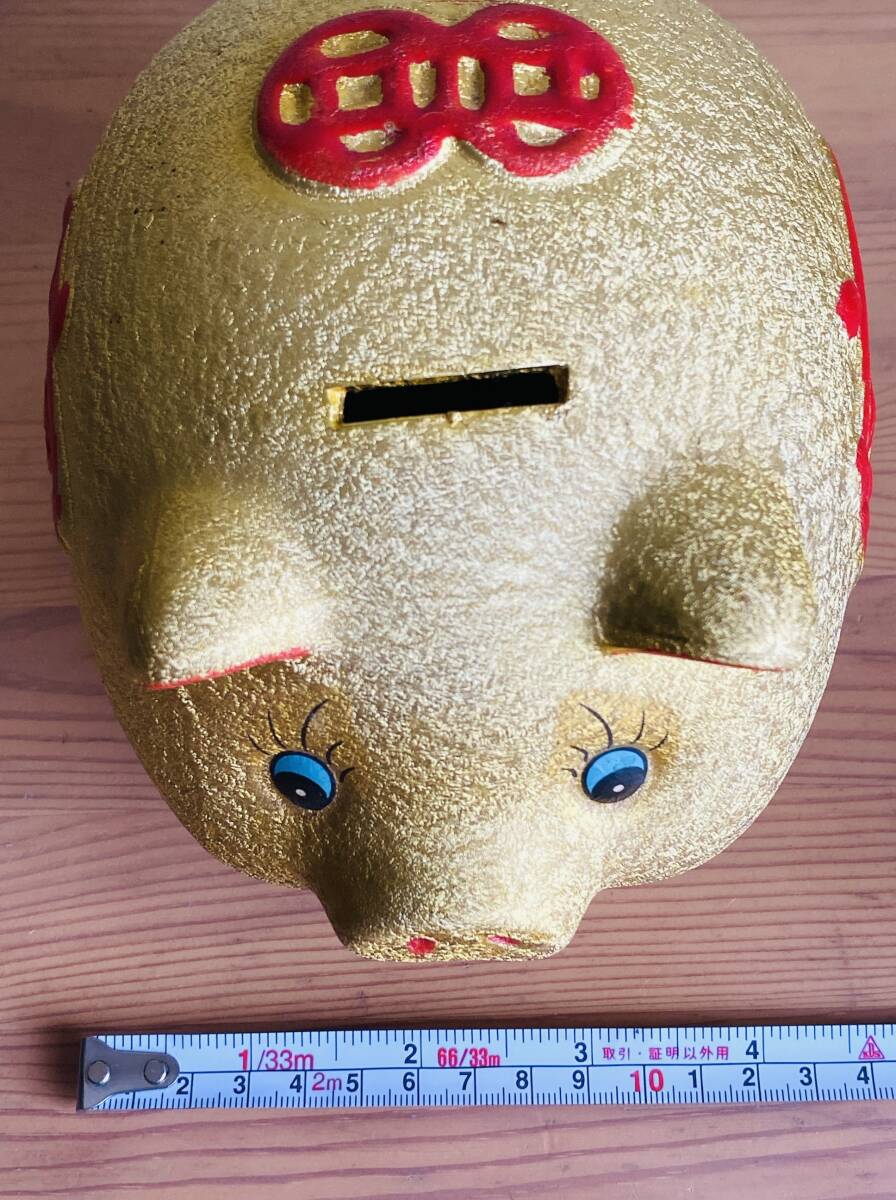 2年ほど前にお土産屋さんで購入。この商品は仕上がりにムラがあるようで、赤い塗り部分はこれでも綺麗なものを選びました。1ヶ月ほどは飾っていましたが、インテリアに合わないため、以降は自宅保管です。豚は「多産の象徴」や「とんとん拍子」の語呂合わせなどから縁起物として知られています。捨ててしまうのは可哀想なので、お好きな方に引き取っていただけると嬉しいです。