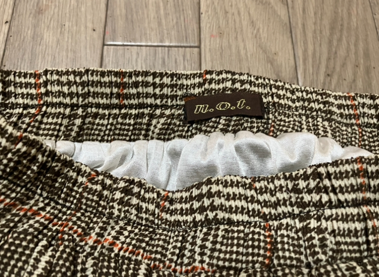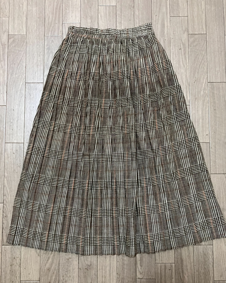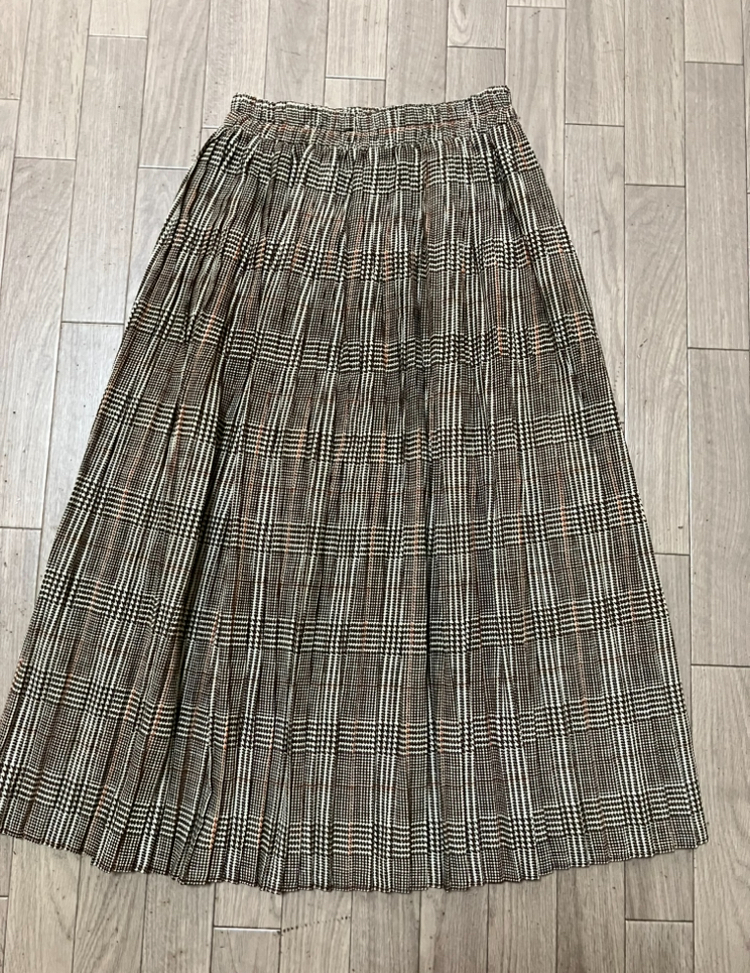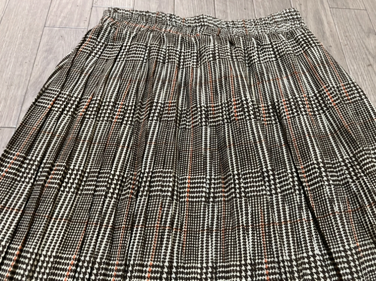 合わせやすいブラウン×アイボリー×オレンジ系のチェックのプリーツスカートです。