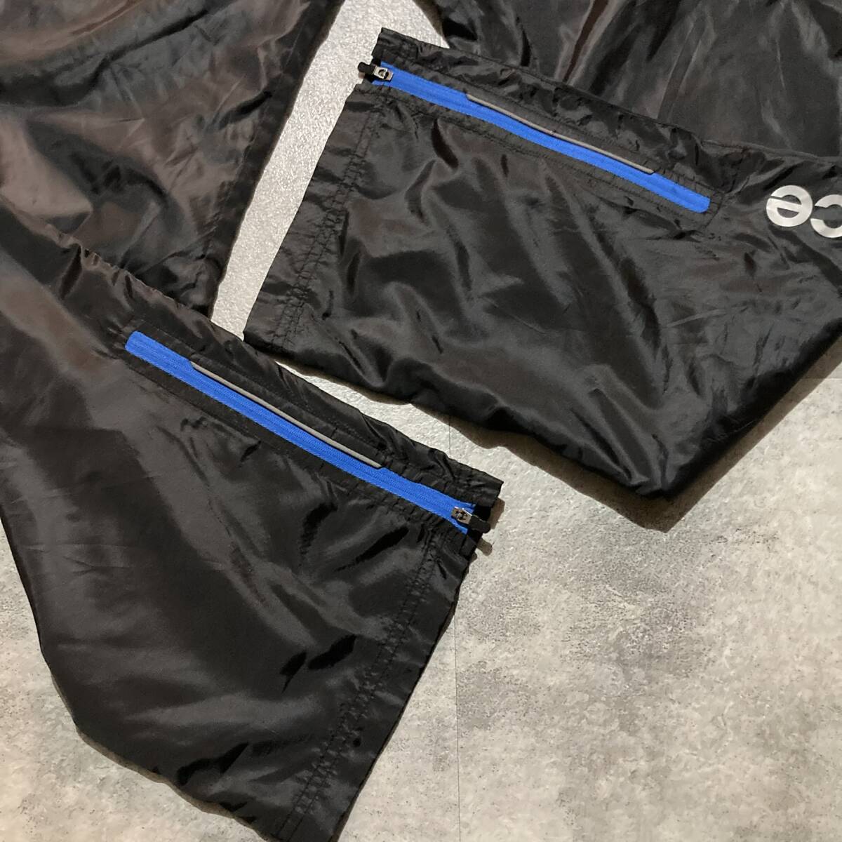 ブラック地にブルーのラインとシルバーロゴプリントがよく映えるトレーニングパンツ。