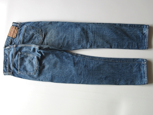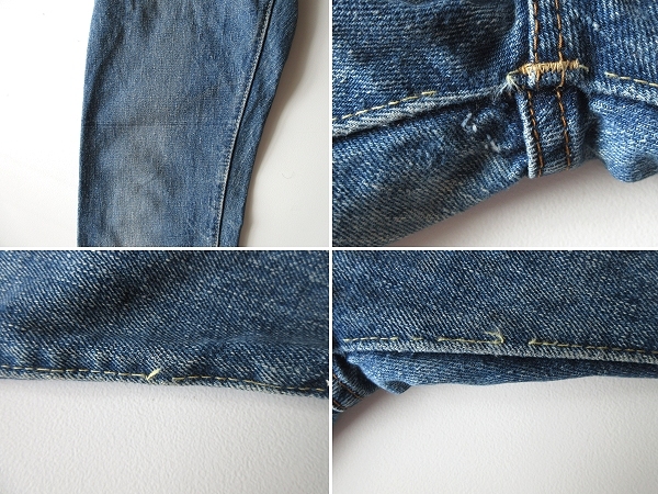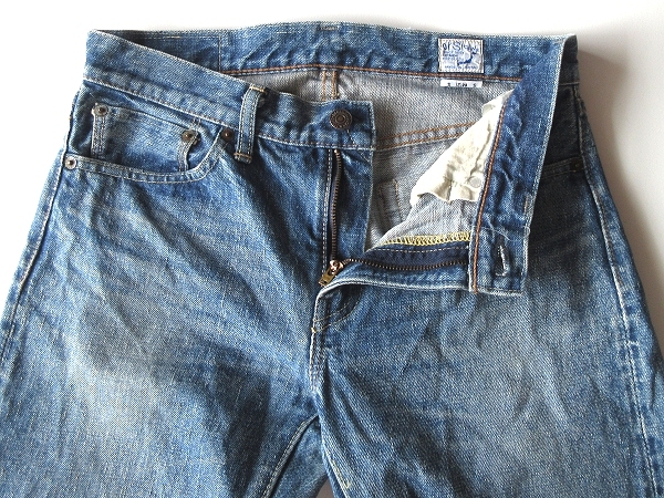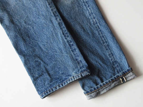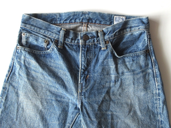 内股と左脚内側に細かなステッチ飛び・右脚に生地製造段階で出来た線状のアタリや織キズのようになった箇所が御座いますが(※画像参照)、着用に差し支えるようなダメージや目立った汚れは見受けられませんので、これからご使用して頂くのに十分良好な状態です。(※色落ちやアタリは加工によるものです。)