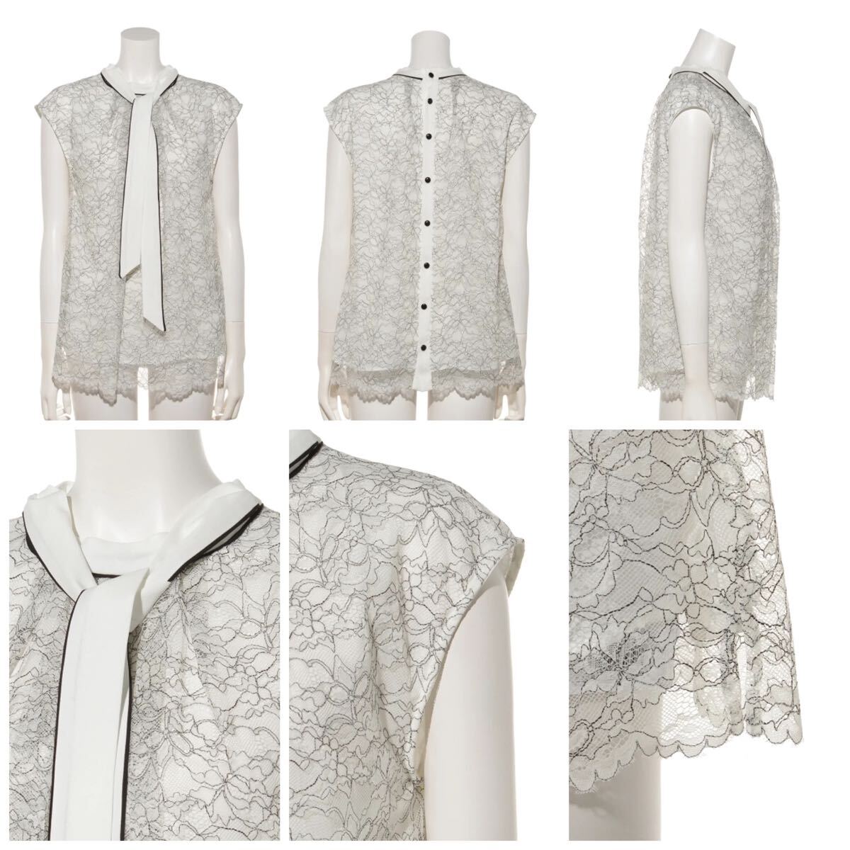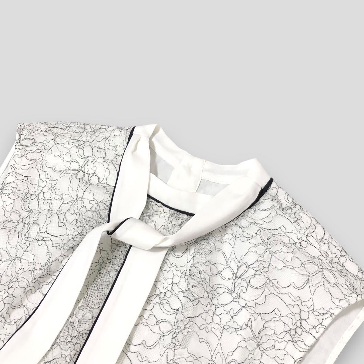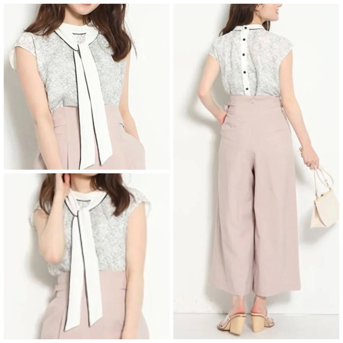 総レースのフェミニンなブラウス。さらにボウタイをプラスする事で、品のある大人スタイルへと導きます。