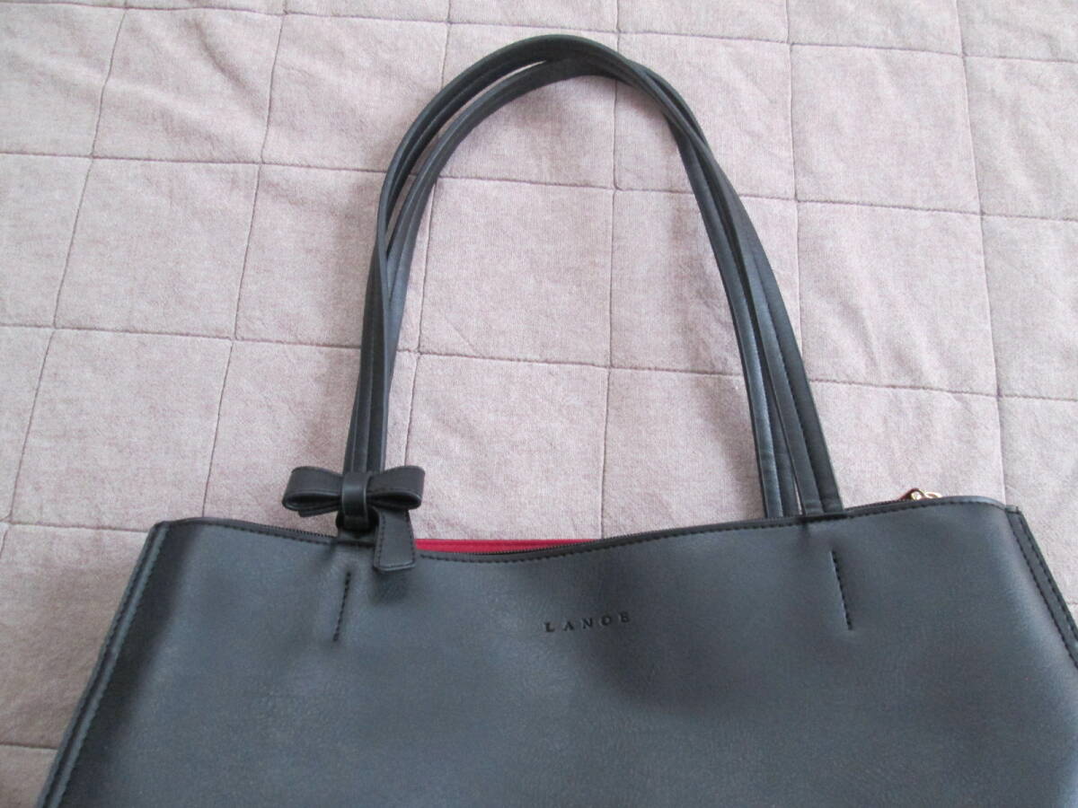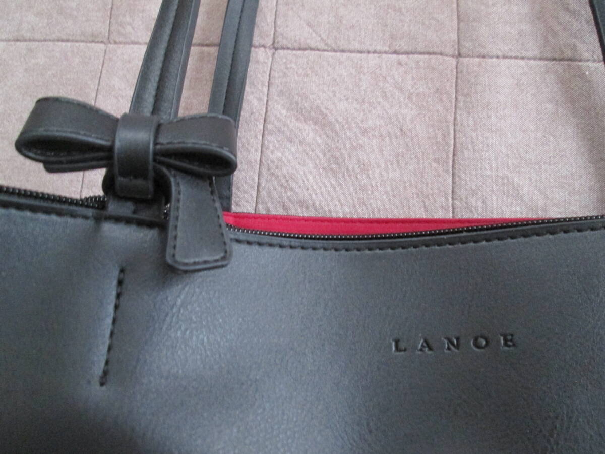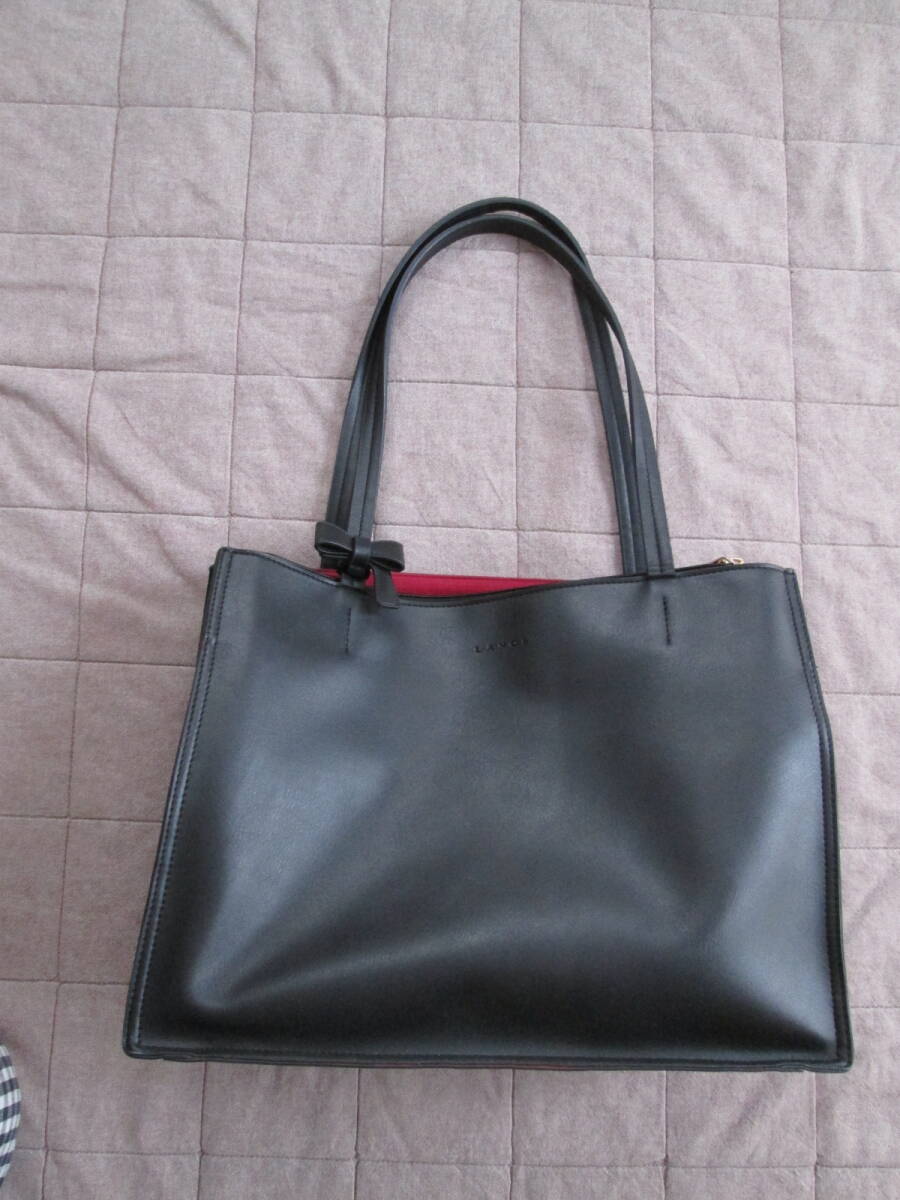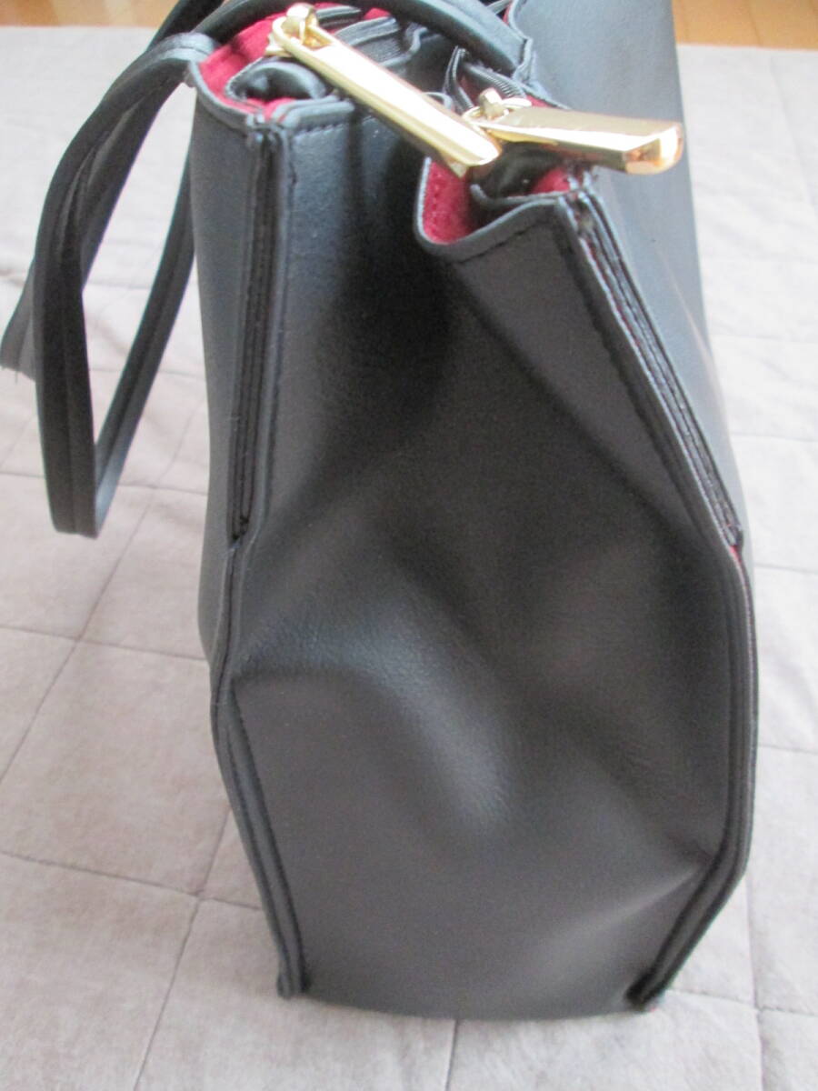 新品・未使用 LANOE 収納いっぱいの合成皮革トートーバッグ 黒 リボン+内布ベルベット風赤色/ビジネスバッグ・おでかけバツグにもどうぞ
