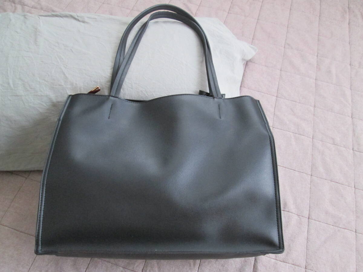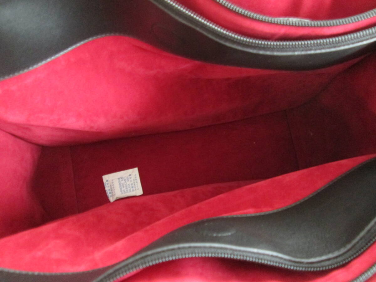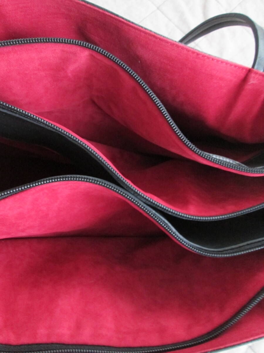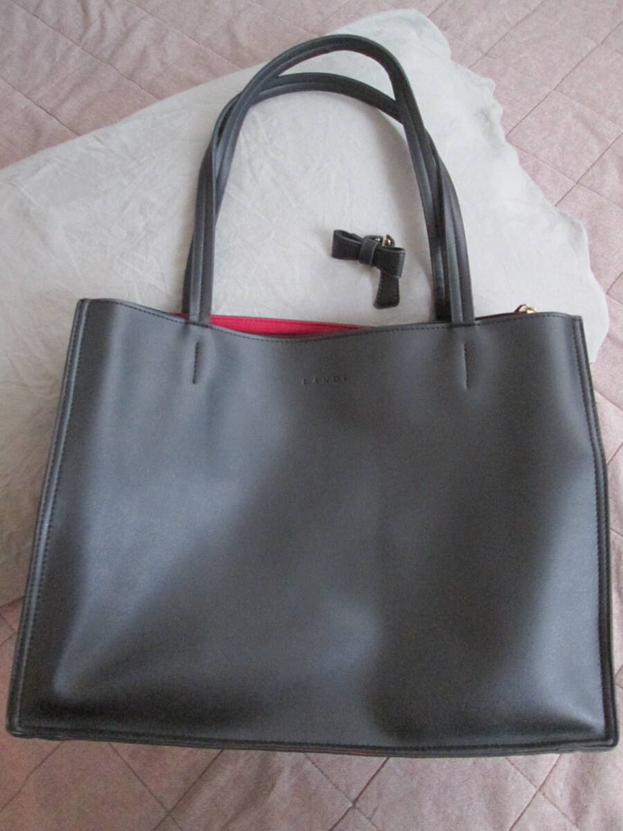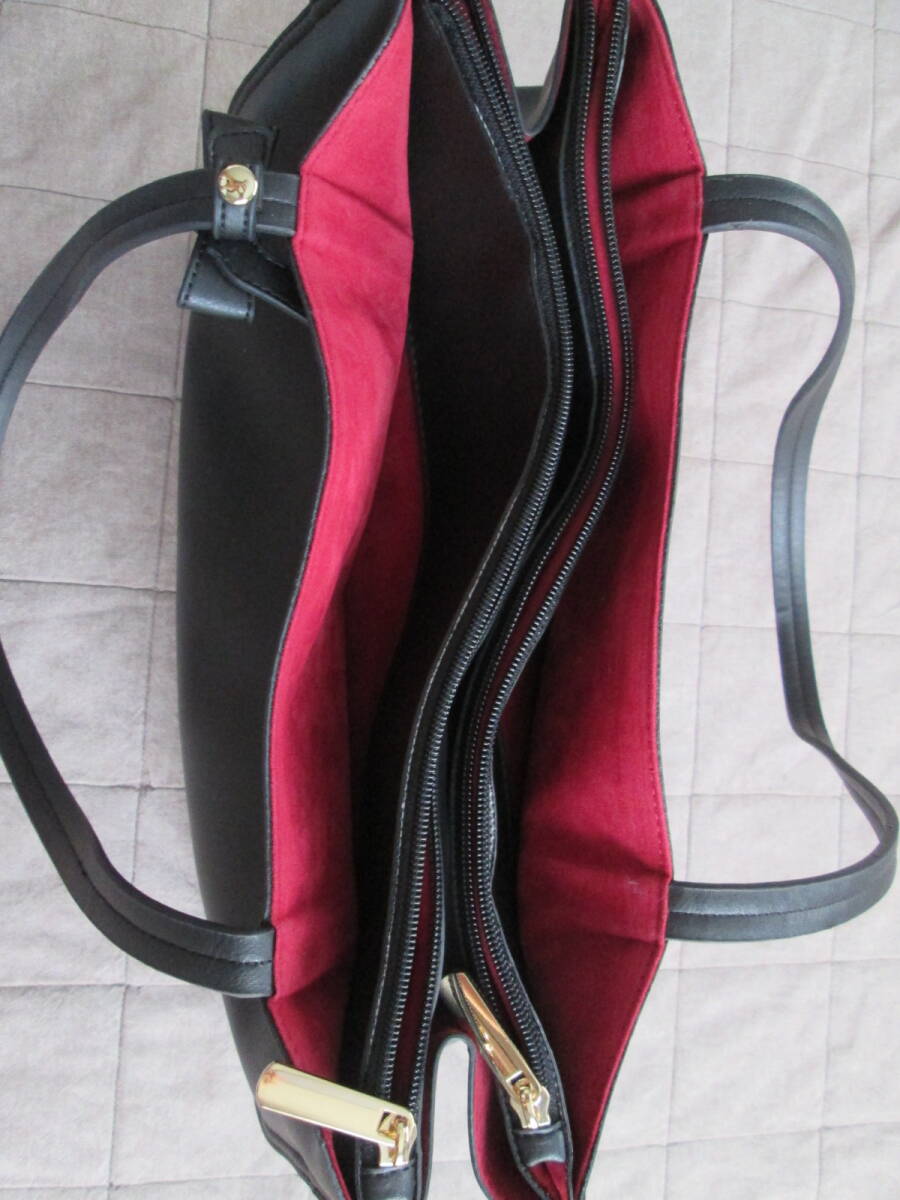 新品・未使用 LANOE 収納いっぱいの合成皮革トートーバッグ 黒 リボン+内布ベルベット風赤色/ビジネスバッグ・おでかけバツグにもどうぞ