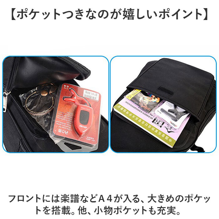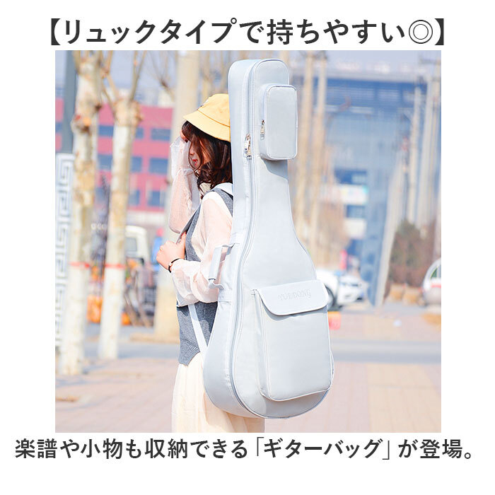 商品説明 | ・・【リュックタイプで持ちやすい◎】 ・楽譜や小物も収納できる「ギターバッグ」が登場。 ・【ハンズフリーで移動ができる!】 ・リュックタイプなので、大きいギターも簡単に持ち運び!両手が空くから他の荷物を持つことも◎ ・【ポケットつきなのが嬉しいポイント】 ・フロントには楽譜などA4が入る、大きめのポケットを搭載。他、小物ポケットも充実。 ・【固定バンドつきで安心】 ・ギターを固定してくれる、面ファスナー仕様のバンドをプラス。収納のしやすさもGOOD。 ・【便利な取っ手つき】 ・縦にも横にも持てる、取っ手を搭載。状況に合わせてサッと持ち上げられる機能性◎ ・【誰にでも似合う、シンプルデザイン】 ・性別年齢を問わずに持てる、ベーシックデザイン☆飽きが来ないから長く使える! ・【ポケット仕様】 ・フロント:ファスナーポケット×1、面ファスナーポケット×1 |