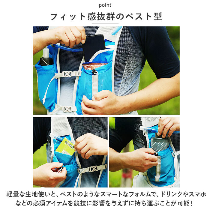 | 商品説明 | ・・競技中の身体にピタッとフィットするスリム設計!ランニングやトレイルランなど、スポーツシーンで活躍する「超軽量 ランニングリュック」が新登場。 ・【フィット感抜群のベスト型】 ・軽量な生地使いと、ベストのようなスマートなフォルムで、ドリンクやスマホなどの必須アイテムを競技に影響を与えずに持ち運ぶことが可能! ・【ハイドレーションシステム対応】 ・面ファスナーフラップで開くメインルーム内側に、ハイドレーションシステム用ポケットを配置。競技中でも両肩の給水ホース穴から水分補給が可能。(※ハイドレーションシステムとはリュックサック内の袋に飲料を入れ、背中から口許まで伸びるチューブによって給水する仕組みのこと。) ・【トレーニンググッズをひとまとめ】 ・スリムな見た目ながら、ハイドレーションシステムを使用しないときには、スポーツウェアの着替えやタオル、ミニ折りたたみ傘などをミニマルに収納可能。 ・【小物にクイックアクセス】 ・ショルダーベルト正面に、ウォーターボトルやスマホが収納できるドローコード付きポケット×2に、パスケースサイズのファスナーポケット×1など、小物がスグに手に取れるにミニポケットを装備。 ・【トレッキングツール携帯可能】 ・正面でクロスしたドローコードには折りたたみ式のトレッキングポールを取り付けたり、汗を拭いたタオルなどを挟んで持ち運びが可能。 ・【長時間の着用でも快適】 ・ショルダーベルトはキメの細かいメッシュ生地、背面の中央部分は通気性の高い3Dメッシュクッションで仕上げ、大量に汗をかく運動中でもサラサラと快適。 ・【体型に合わせて調節可能】 ・サイドベルトと上下位置が調整できる2本のチェストバックルでリュックが身体にフィット!ランニング中もズレにくく、競技のパフォーマンスが向上。 ・【キラリと光るリフレクター】 ・リュック前面のドローコードのループやショルダーベルトにリフレクター素材のラインを配置。自動車のライトにキラリと光って、夜間のトレーニングでも大活躍。 |