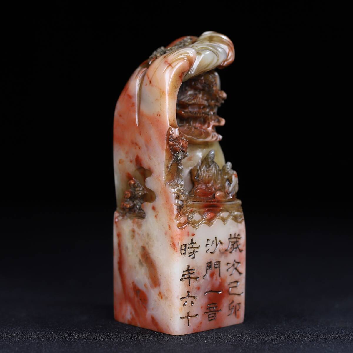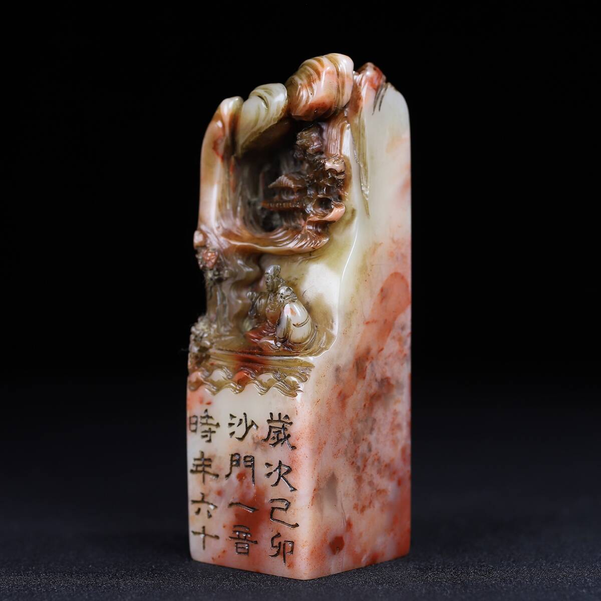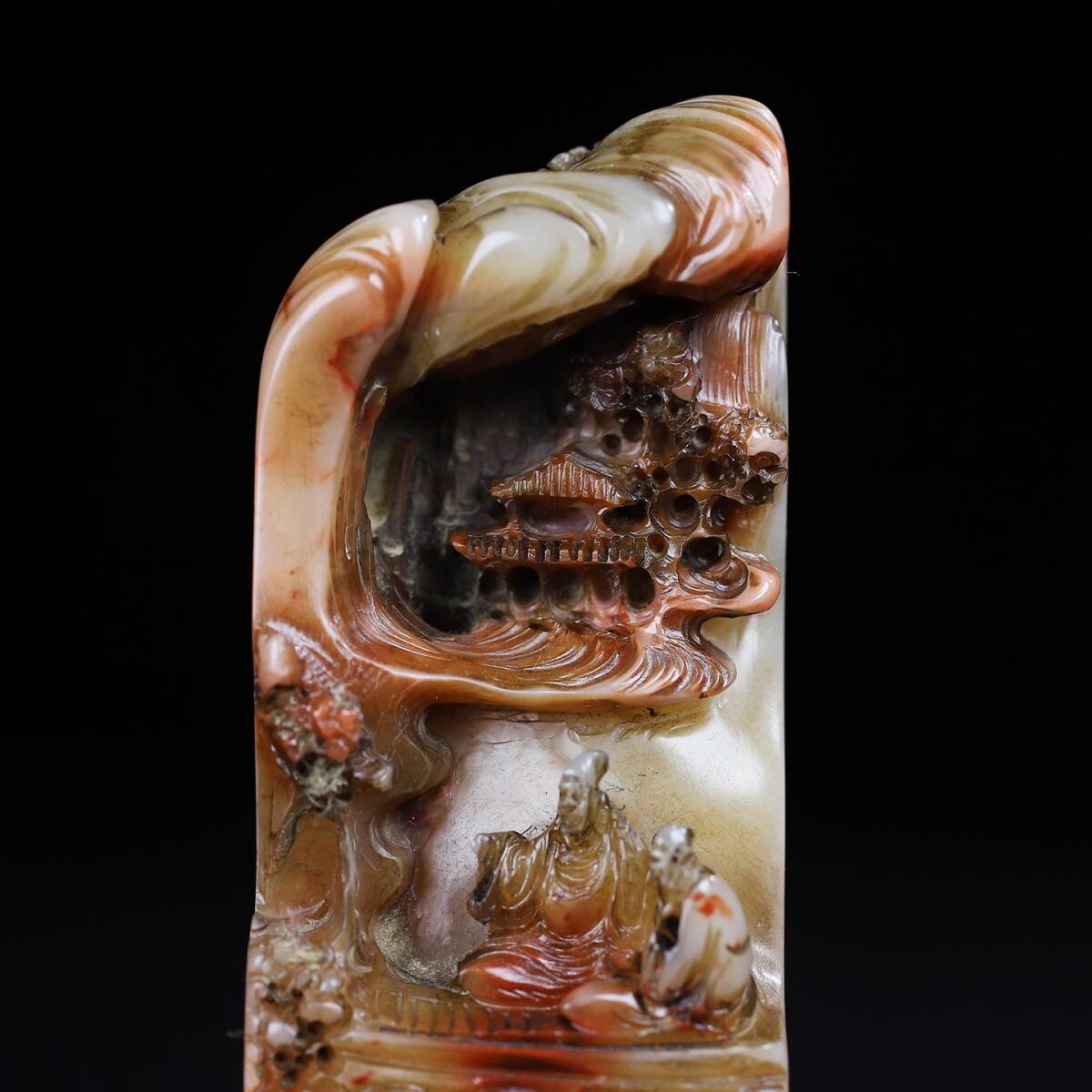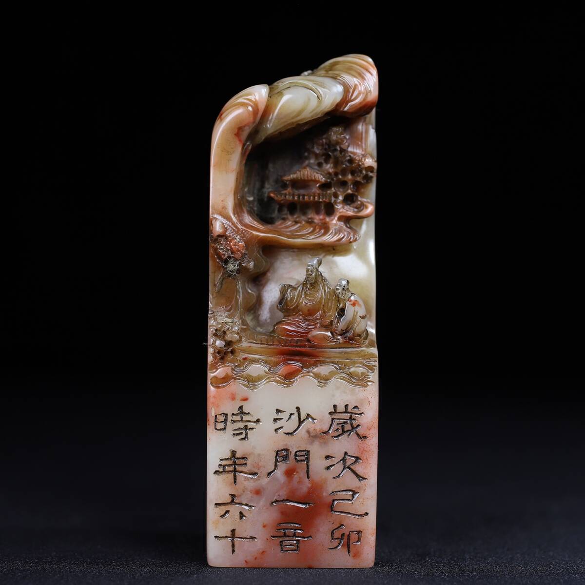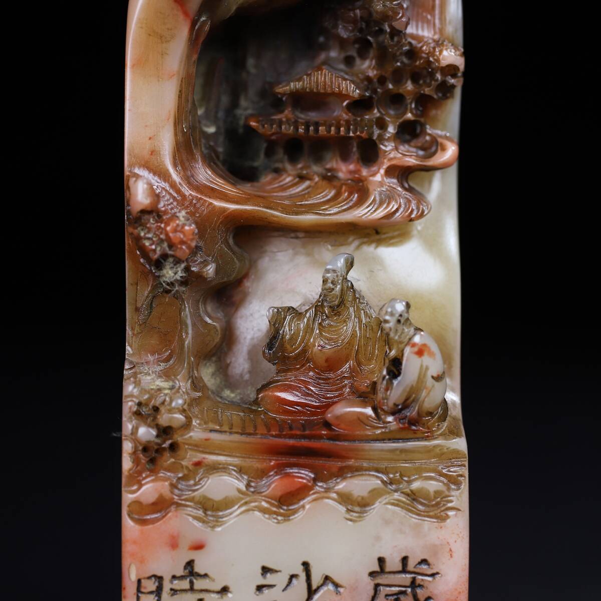 旧蔵 清 寿山石 深山の会友 人物紋 印鑑 天然石 篆刻 古印材 極細工 中国古玩 骨董品 古美味 206-21