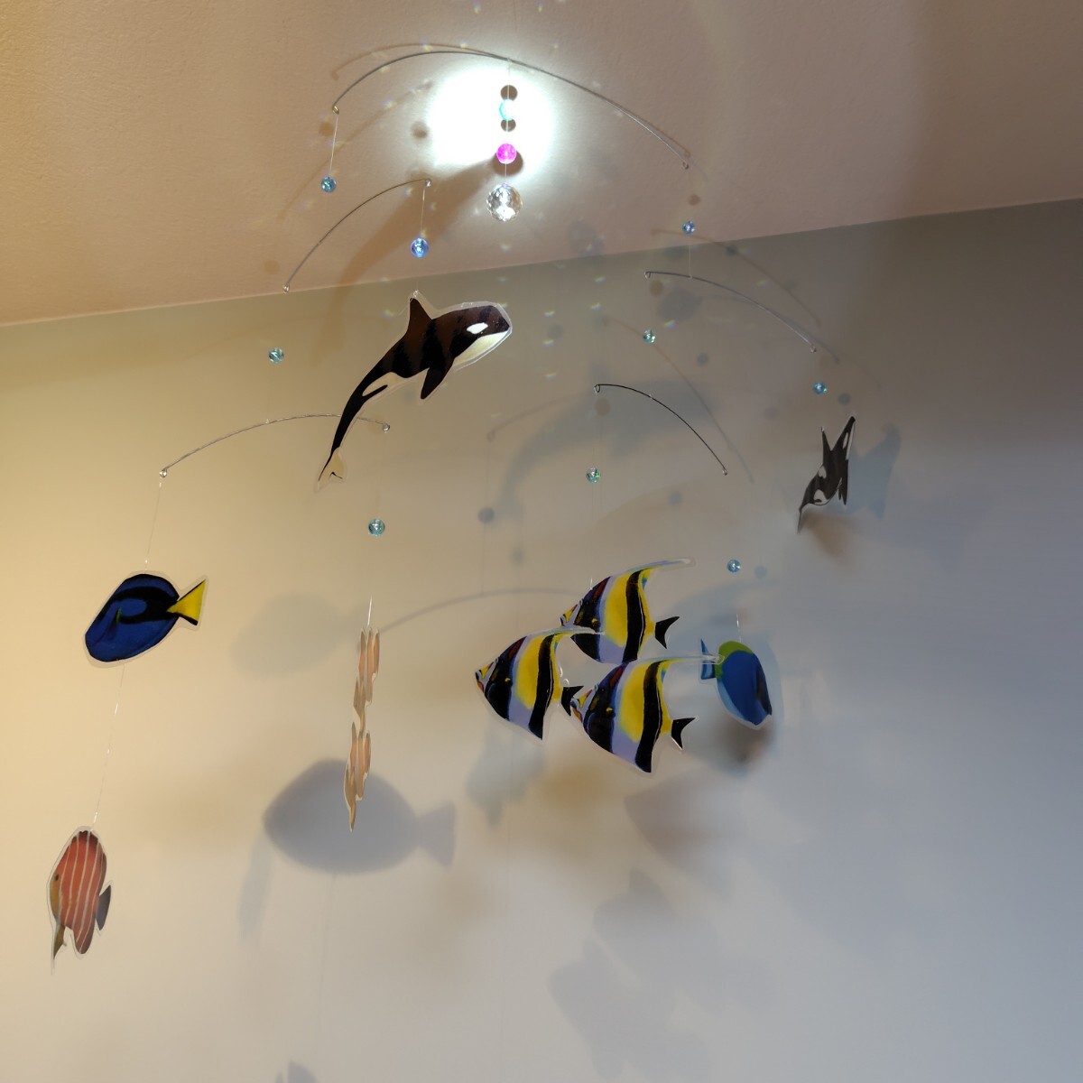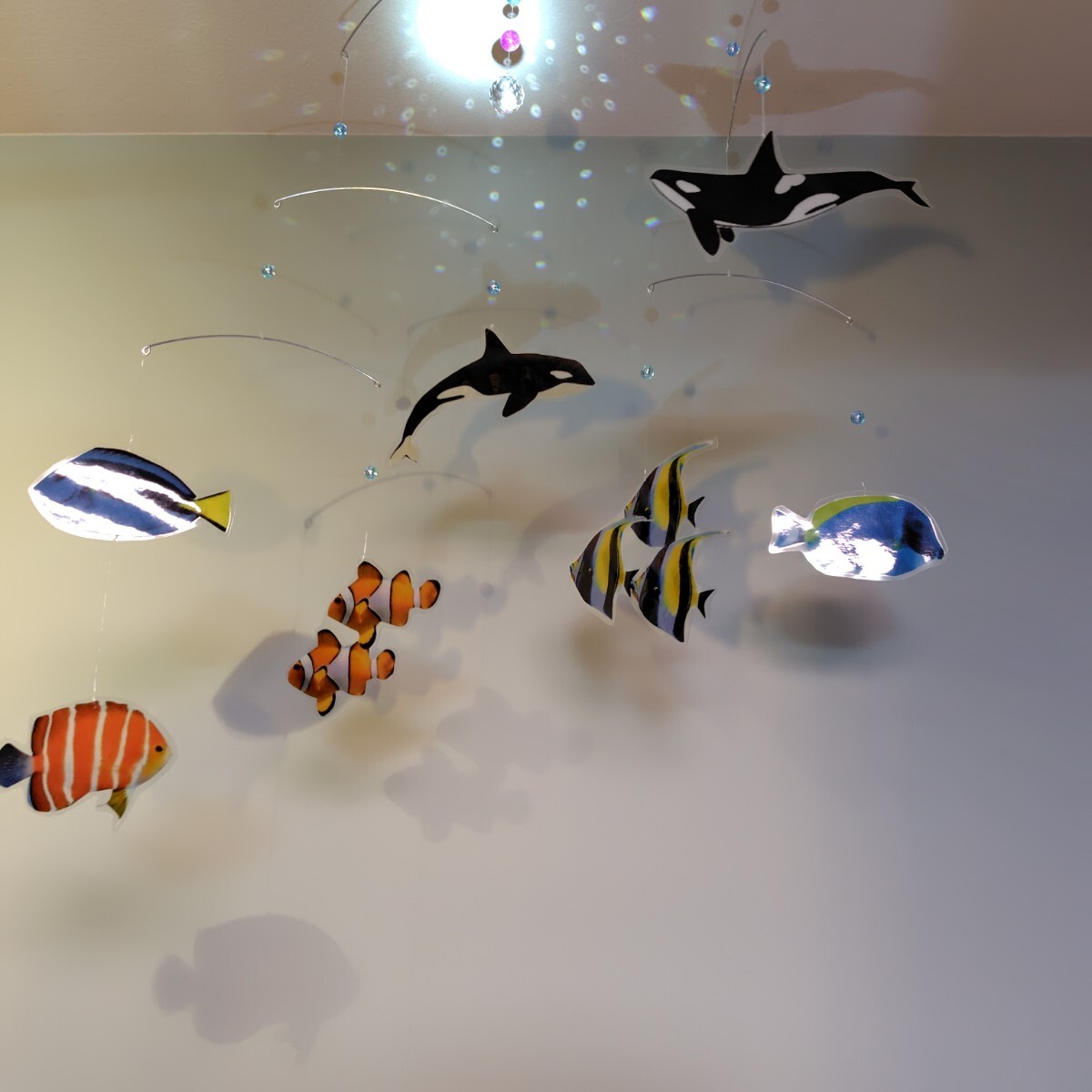 オルカ シャチモビールとは動く彫刻。魚を糸や針金でつるし、それらがバランスを保ちながら、わずかな風で微妙に動くようにしたものです(*^^*)