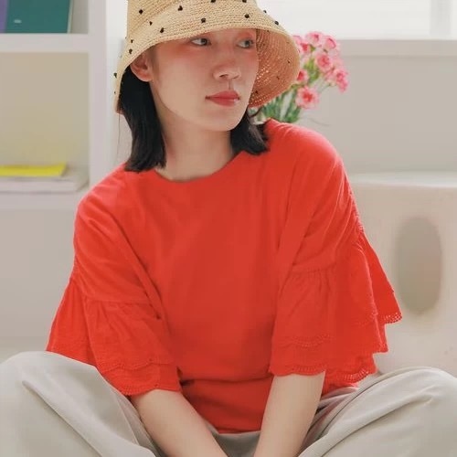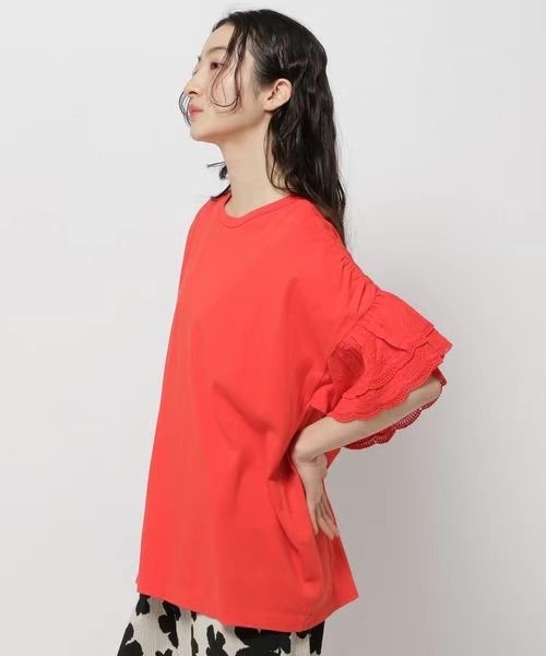ns 0706 トップス Tシャツ チュニック レースふんわり袖 大人可愛 半袖 フリーサイズ ナチュラル ゆったり 綿100% レッド