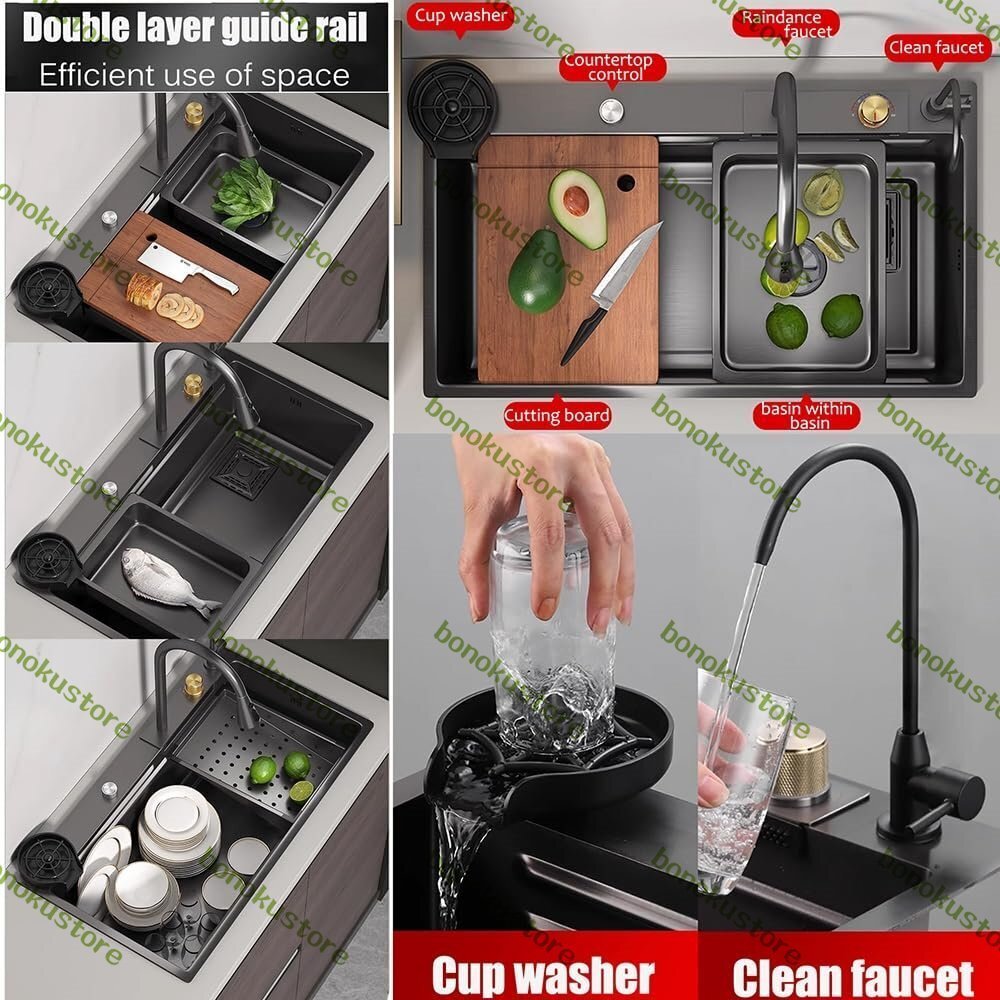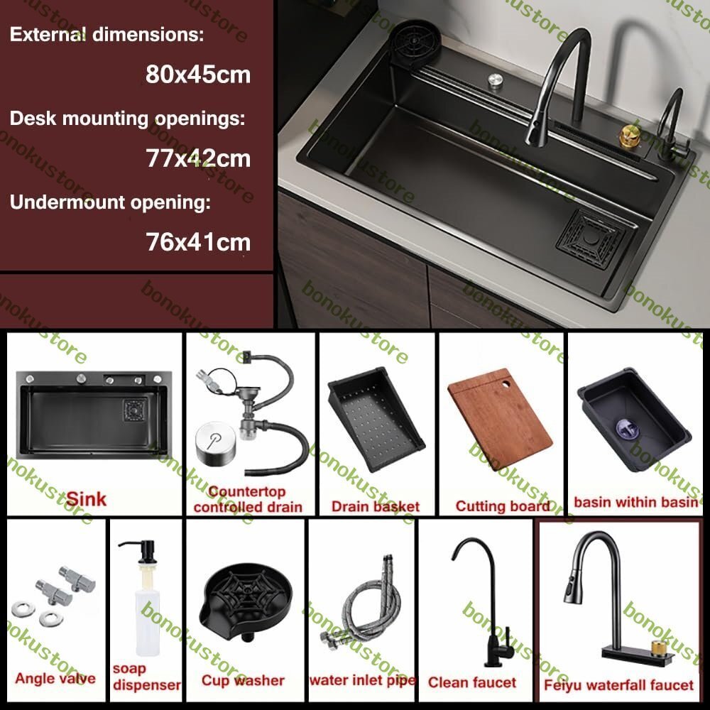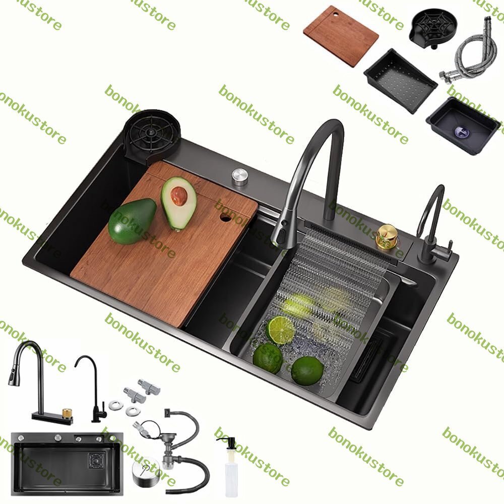 家庭用のキッチンシンクは、家のどこでも使用できます。ボウルや皿、汚れた日用品を洗うのに役立ちます。また、洗面台としても使用でき、家の掃除の補助にもなります。製品仕様:-材質: 304ステンレス-色: ブラック-寸法: 24x18インチ(60x45cm)、26x18インチ(65x45cm)、27x18インチ(68x45cm)、28x18インチ(72x45cm)、30x18インチ(75x45cm)、31x18インチ(80x45cm)。- 奥行き: 21 cm/8.3 インチ-特徴: 引き出し式蛇口、滝型蛇口、カップワッシャー、二重ガイドレール、排水コンソールの制御- 適用場所: 農家、キッチン、バー、アパート、ランドリールーム、RV、ガレージ、バルコニー、ワークステーション、レストラン。- 取り付け:上部取り付け、埋め込み、カウンター下取り付け。パッケージ内容:シンク×1排水バスケット x1給水管×1まな板×1フライングレイン滝型蛇口 x1カウンタートップコントロール排水x1盆地の中に盆地 x1カップウォッシャー×1アングルバルブ×1ソープディスペンサー x1クリーン蛇口 x1ノート:手作業で計測しておりますので、1?3cmの誤差が生じる場合がございますので、実際の商品を参考にしてください。