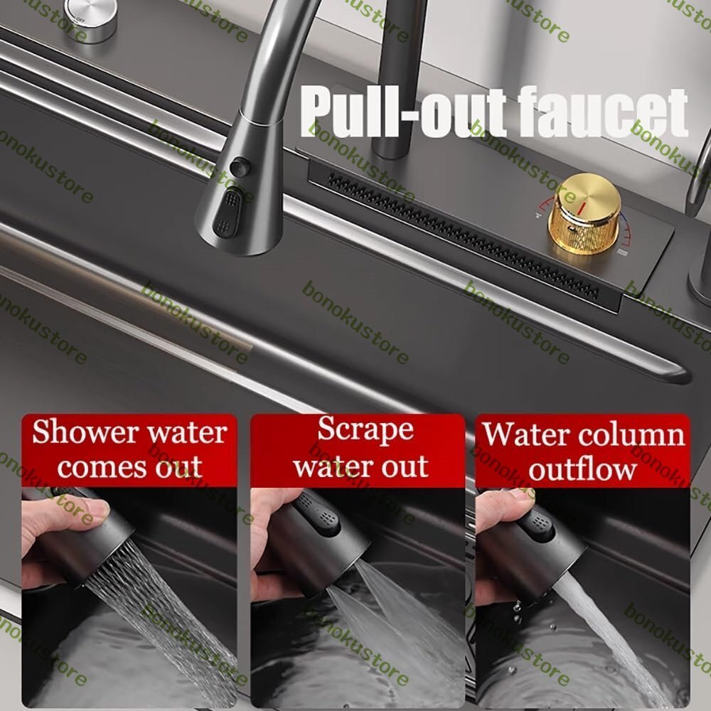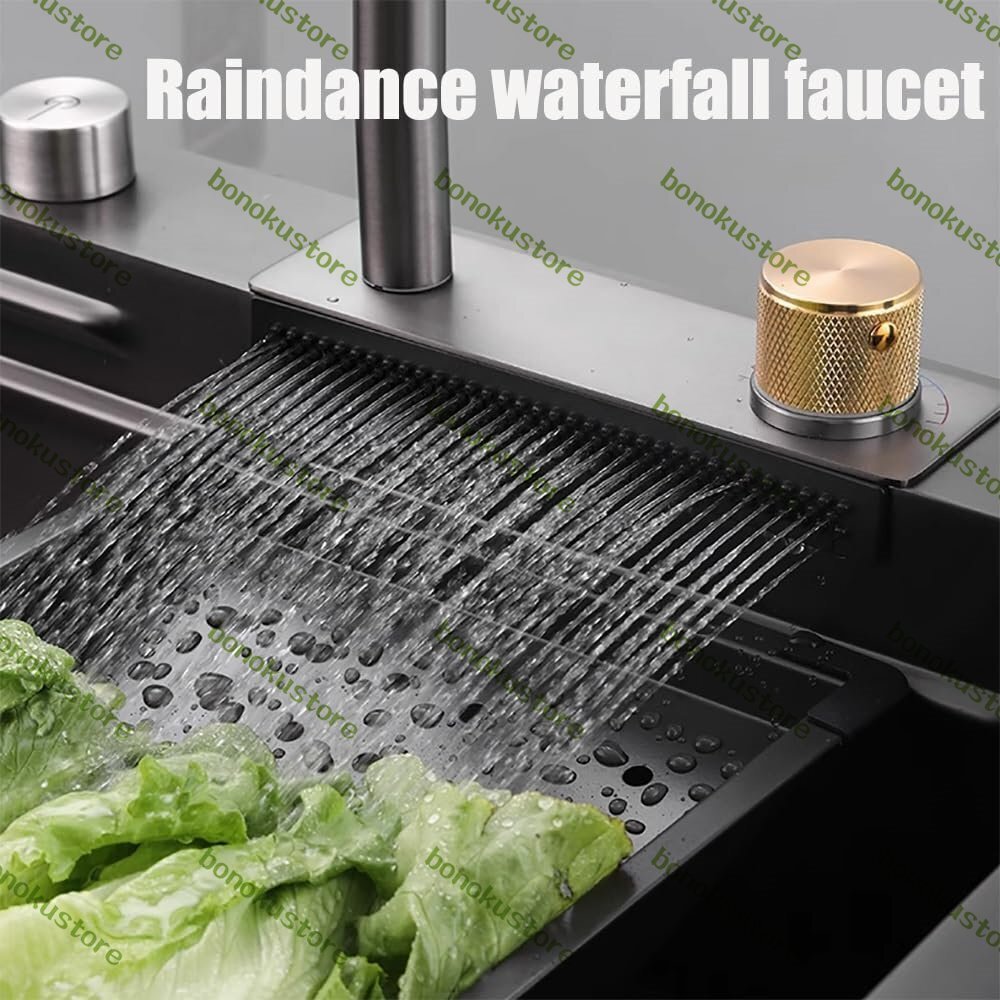 【モダンなキッチンシンク】引き出し式の蛇口とレインダンスの滝型蛇口は、4つの散水モードを備えており、優しく水しぶきが出ず、さまざまな洗浄シナリオに対応します。ゴールドのノブで蛇口モードと滝モードを切り替えます。