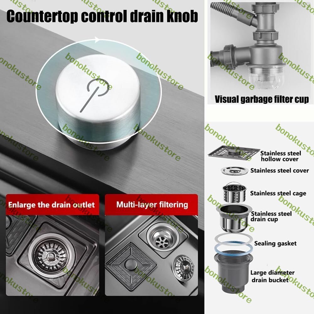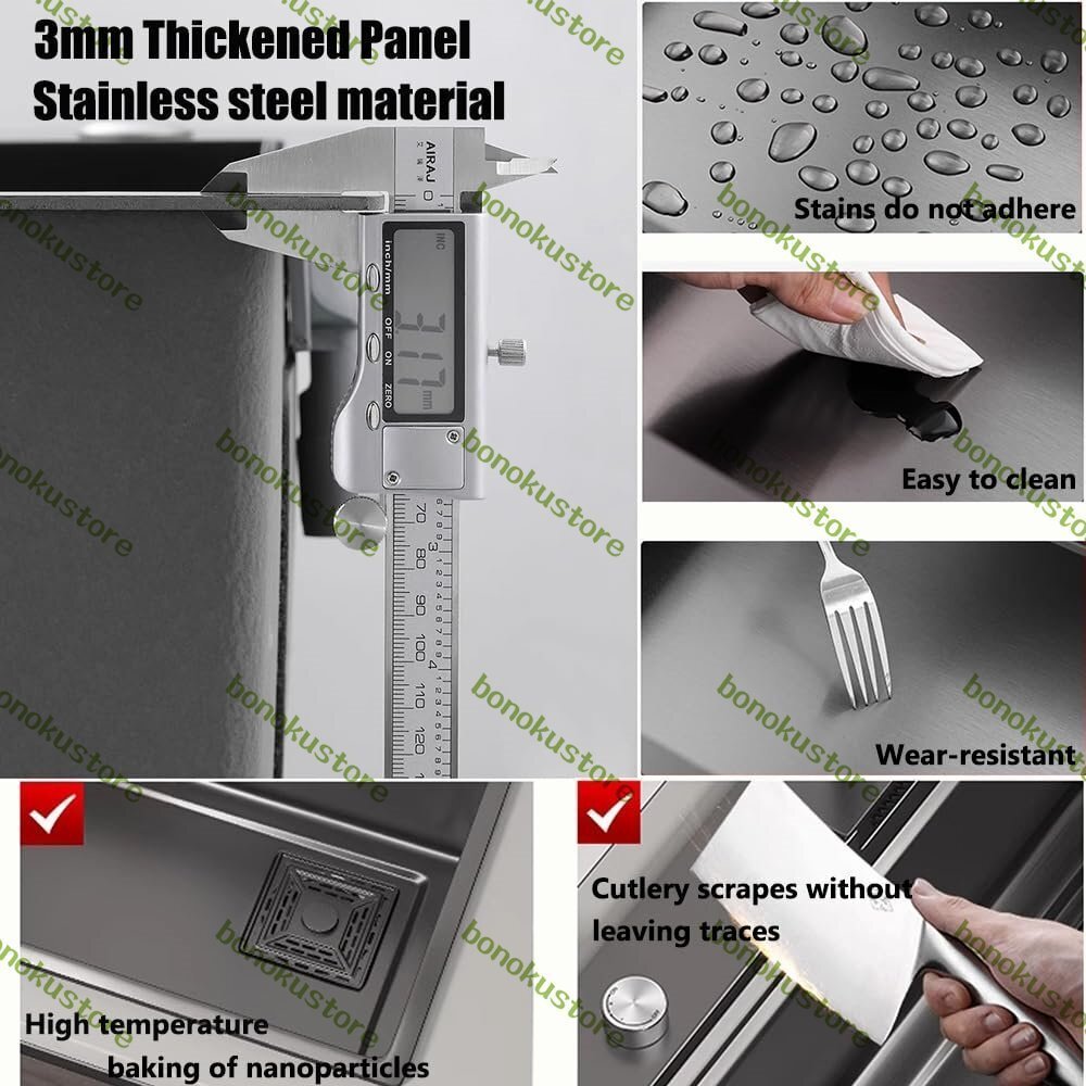 【ステンレス製シンク】家庭用キッチンシンクは304ステンレス製で、ナノ粒子で高温で焼き上げられており、傷が付いても跡が残らず、汚れも簡単に掃除できます。厚さ3mmで頑丈で変形せず、底部/上部/フラッシュマウントで設置できます。
