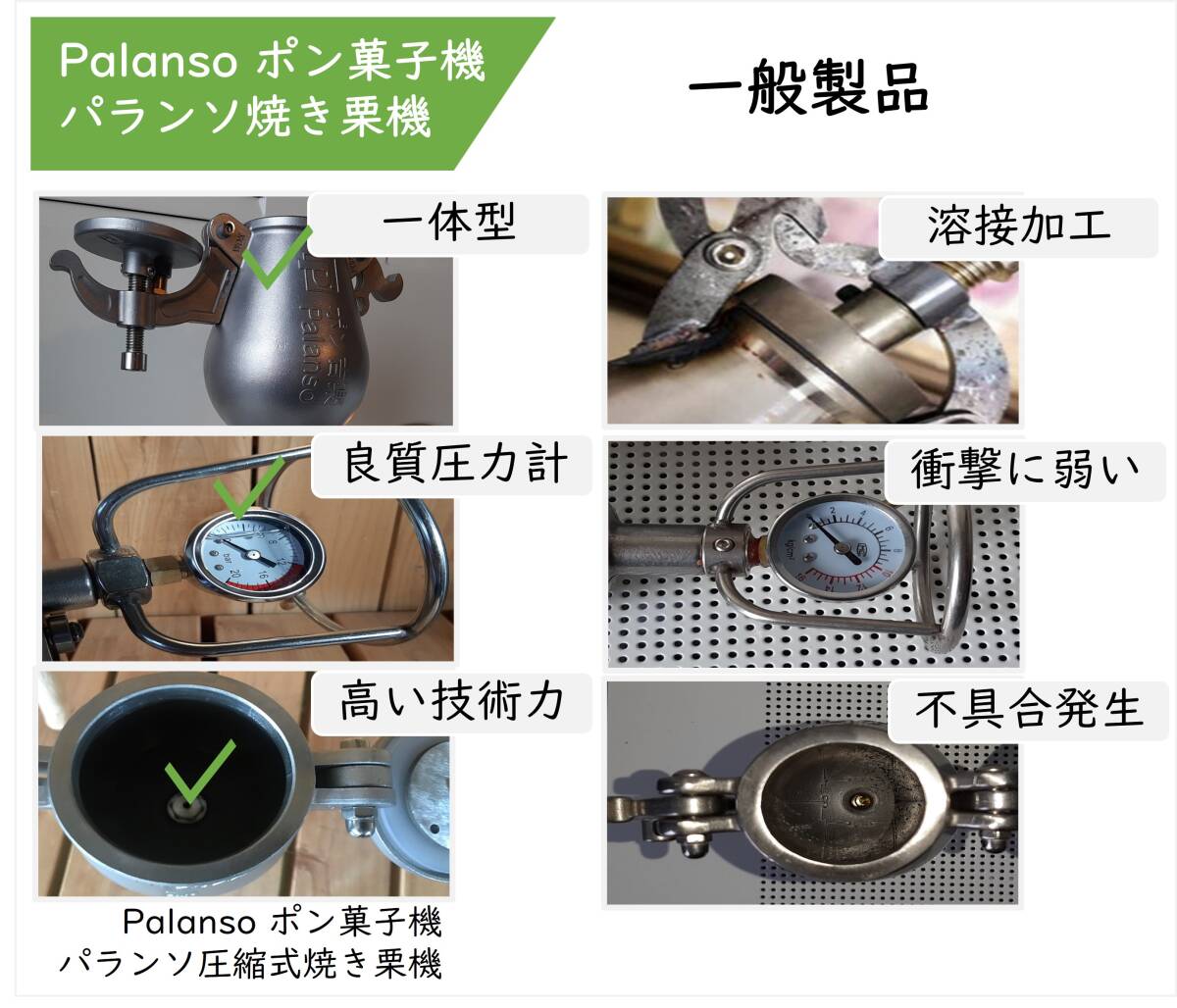 Palansoの製品を知り、最初は焼き方がわからず、シリコンを焼いて慌てました。しかし、焼き終わって食べますと、あの丹波の焼き栗でした。50万円以上する機械と同じ焼き具合。驚きました。栗を包丁で2センチほど切り、7の圧まで焼くと、見事な焼き具合です。本当に素晴らしい製品です。<購入者>