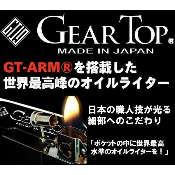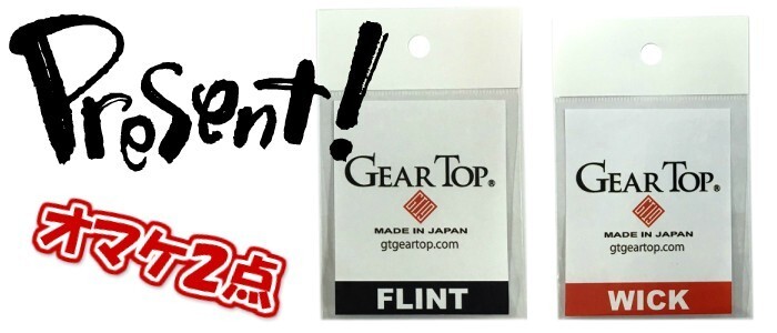備考 | オイルはZIPPO用オイル、オイルライター用をご使用ください。 *お買い上げいただいた方にギアトップ専用フリント、専用ウィック(計2点)をプレゼント中! フリント(石)は5ケ入り、ウィックは2本入りです。 |