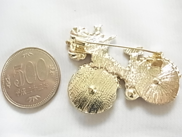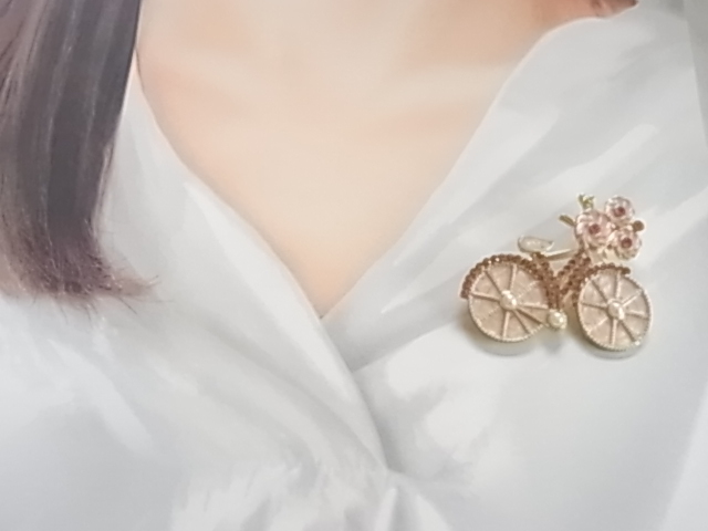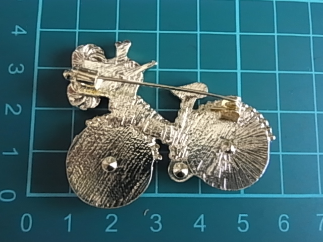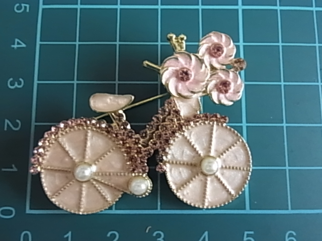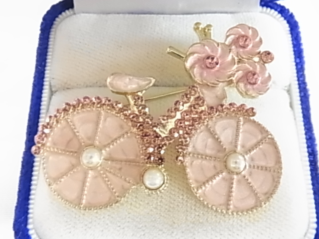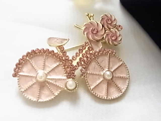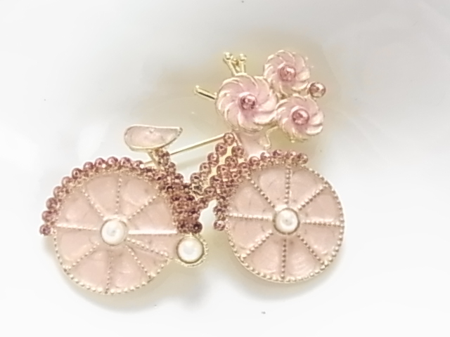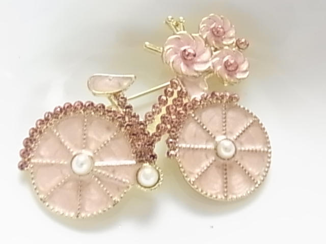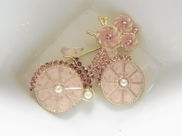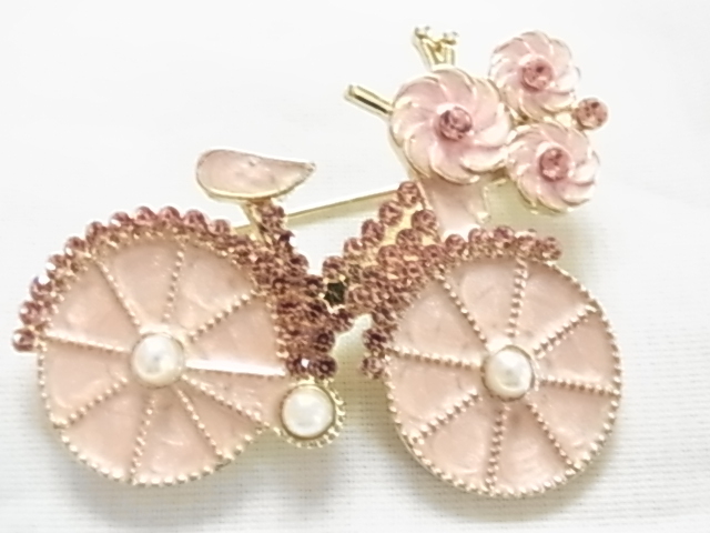 □未使用 可愛らしいフレッシュピンクトーンの自転車モチーフ ピンクのラインストーンとパールトーンストーンが輝くビジュー ブローチ