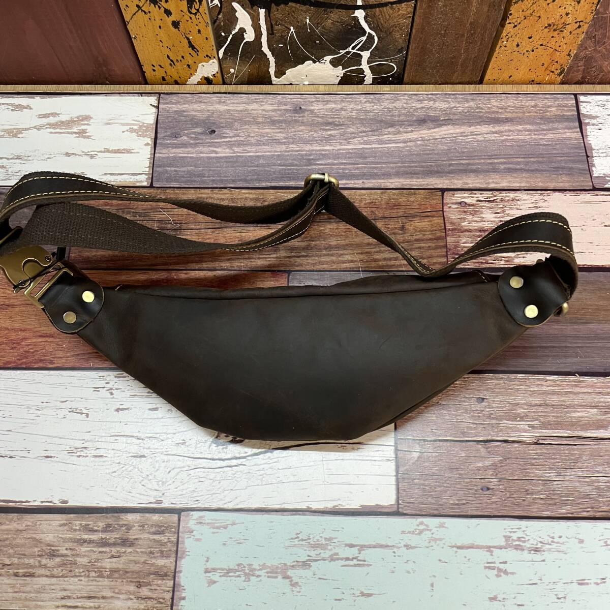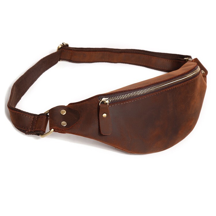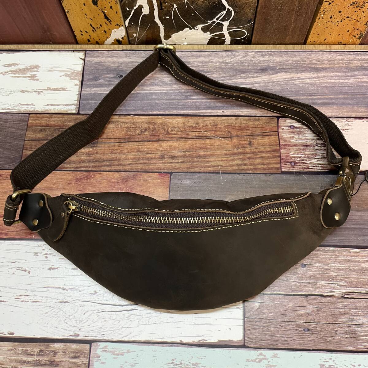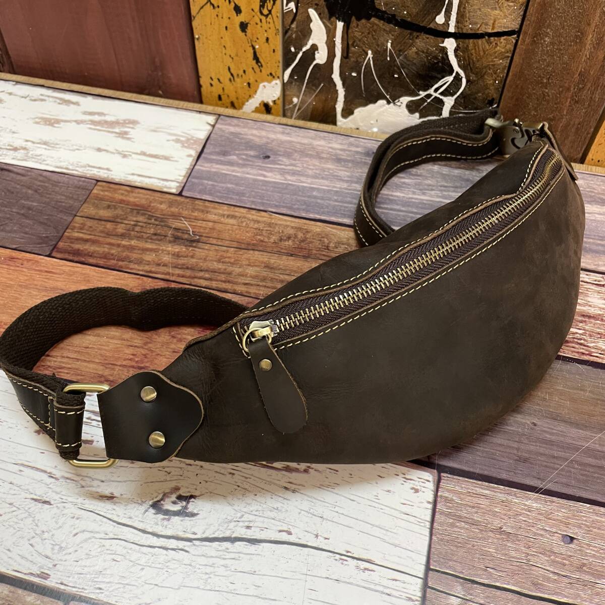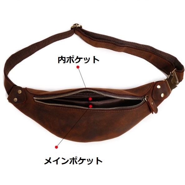 新品 本革レザー三日月型ボディバッグ メンズ ウエストバッグ ダークブラウン ヌバッグ 釣り ツーリング アウトドア バーベキュー 送料無料