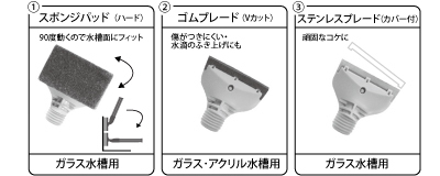 商品名:おそうじスクレーパー3 お掃除便利グッズ 水槽面のお掃除の用途に合わせて使い分けができます。 パーツを組み合わせて楽しく掃除出来ます。 ■セット内容 ・ハードスポンジパッド ・Vカットゴムプレート ・カバー付きステンレスプレート ・コネクトパイプ ・グリップ →メーカーホームページはこちら |