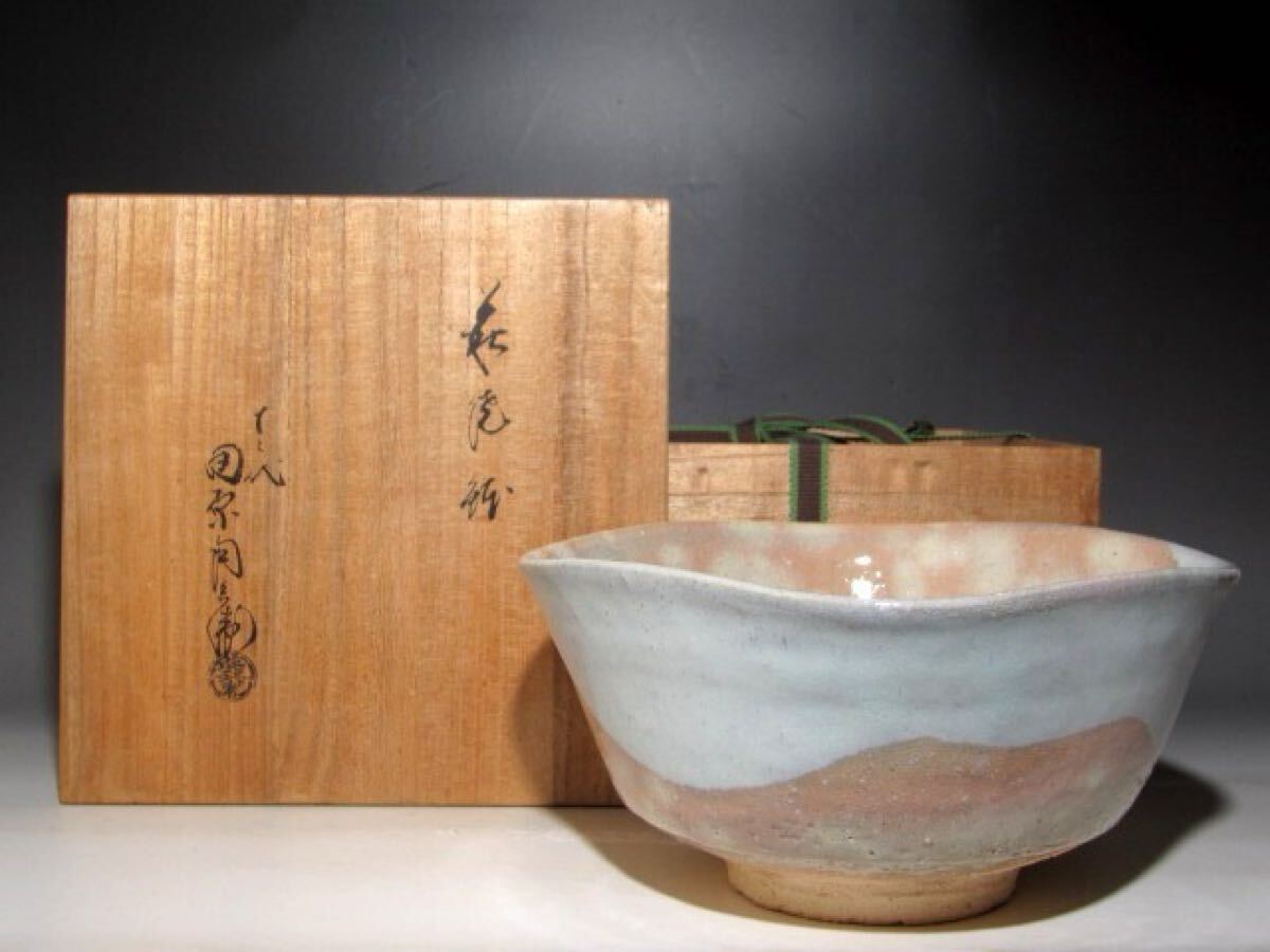 十二代 田原陶兵衛作の萩菓子鉢です。 穏やかな景色の大変雰囲気の良い作品です。 箱蓋裏に裏千家十四世淡々斎の花押があります。 【十二代 田原陶兵衛(たはら-とうべえ)1925-1991】 昭和後期-平成時代の陶芸家。 昭和31年萩焼深川(ふかわ)窯の12代陶兵衛を襲名。 47年日本工芸会正会員。56年山口県指定無形文化財。本名は源次郎。 サイズ 直径20.5cm/高さ10cm(多少の誤差はお許しください) 状態 一見して疵やヒビ・直しは見られません。 骨董品という事をご勘案頂き、時代経過のスレや、小さな傷がある場合があるかもしれませんのでご承知置きください。 | |||