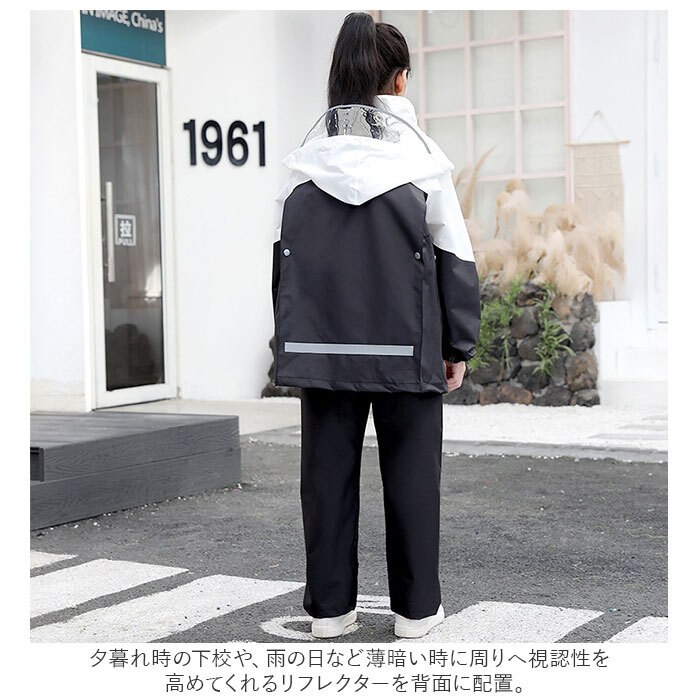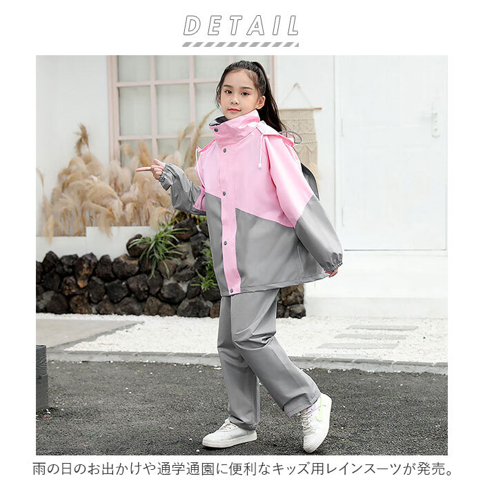 商品説明 | ・・雨の日のお出かけや通学通園に便利なキッズ用レインスーツが発売。 ・スマートなバイカラー仕様のレインスーツ。シンプルなデザインで男女関係なく使用可能! ・ランドセルやリュックを背負ったまま着られる。使わない時は、スナップボタンで留めて着用すればノーマルなレインスーツに。 ・一人で着脱しやすいスナップボタンとファスナーを活用した前開き。二重構造で雨水の侵入をより防ぐ。 ・防水機能はもちろん、通気性もある素材を使用し、通学などで長時間歩いても蒸れにくく快適な着心地♪(※完全防水ではございません。強雨時など水分が浸入してくる場合もございます。) ・フードには、視界を確保しながら雨から顔を守ってくれる透明なバイザーを装備。顔まわりのフィット感を調節できるドローコードも搭載。 ・雨が止んでいる時や傘をさしている時など、使わないときはクルクル丸めて襟元に入れられる仕様に。 ・伸縮性がある袖口で風と雨をしっかりガード! ・夕暮れ時の下校や、雨の日など薄暗い時に周りへ視認性を高めてくれるリフレクターを背面に配置。 ・ボトムスのウエストはお腹が苦しくならないゴムタイプ。 ・専用の収納袋付き。コンパクトに折りたためるから携帯に便利。 |