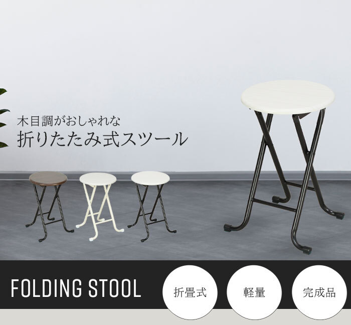 | ダイニングチェアやデスクチェア、来客用のイスなど様々なシーンで活躍する折りたたみスツール。 木目調でおしゃれなデザインがお部屋のアクセントにも。 折りたたみ時の厚さが約7.5cmとスペースをとらないため、ちょっとした隙間に収納でき、軽くて持ち運びもしやすいため、必要な時にすぐ取り出して使うことができます。 座面は塩ビシート仕様なので、汚れてもサッと拭くだけでお手入れ簡単。 安定感のある脚部は傷つき防止の保護キャップ付き。 |