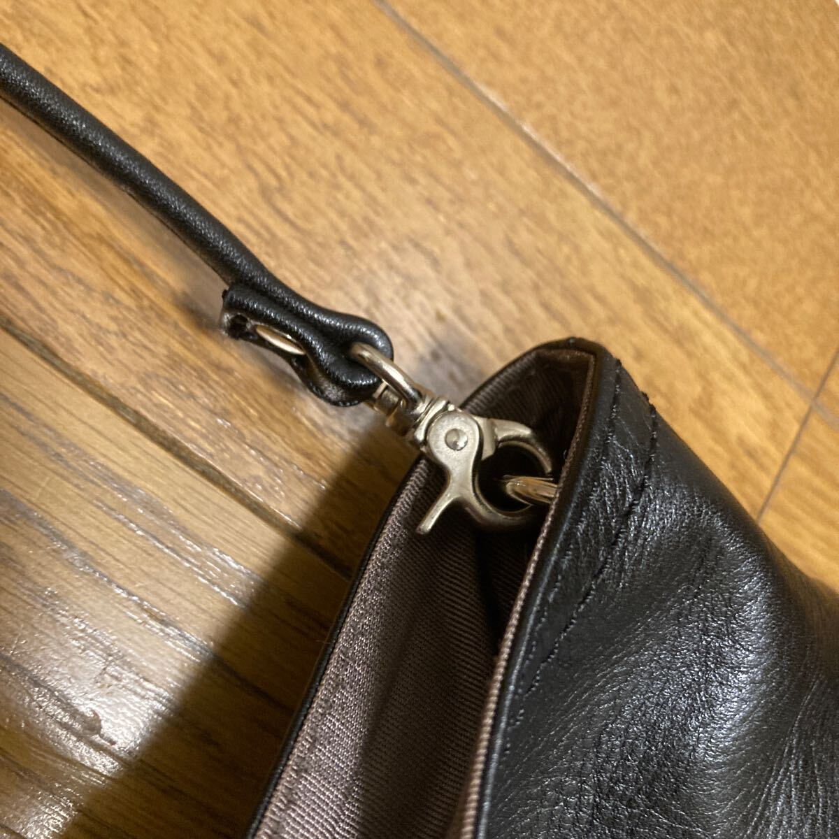 素材は牛革、金具はシルバー色、内側真ん中にファスナーポケット、前面側にファスナーなしポケット2つ、後側にファスナーポケット1つです。